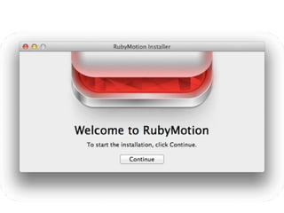 RubyMotion is a commercial toolchain that allows developers to build iOS, Android, and OS X apps using the Ruby programming language. It compiles Ruby code into native applications that can access platform APIs. This allows developers to write apps once in Ruby and share code across platforms while isolating platform-specific code. RubyMotion apps can be packaged for distribution in app stores. The presentation demonstrated RubyMotion and discussed supported libraries, platforms, IDE integration, and resources for learning more.