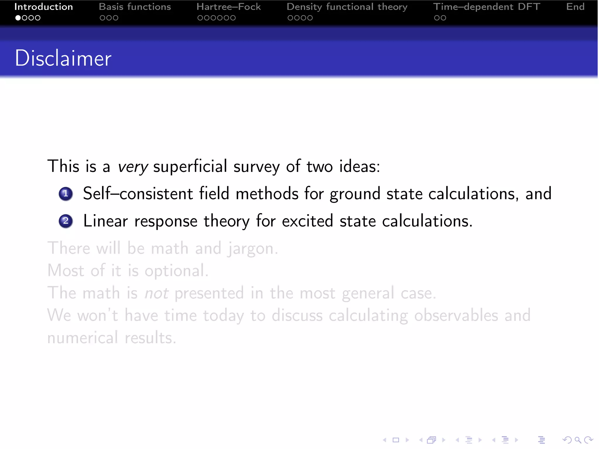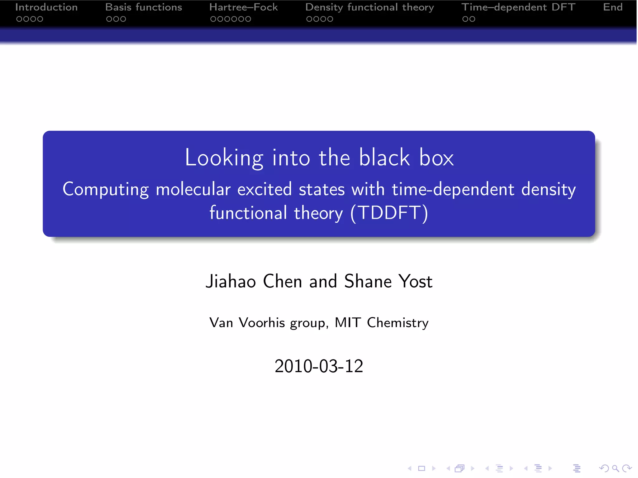 The document provides an overview of time-dependent density functional theory (TDDFT) for computing molecular excited states. It begins with an introduction to the Born-Oppenheimer approximation and variational principle. It then discusses the Hartree-Fock and Kohn-Sham equations as self-consistent field methods for calculating ground states, and linear response theory for calculating excited states within TDDFT. The contents section outlines the topics to be covered, including basis functions, Hartree-Fock theory, density functional theory, and time-dependent DFT.