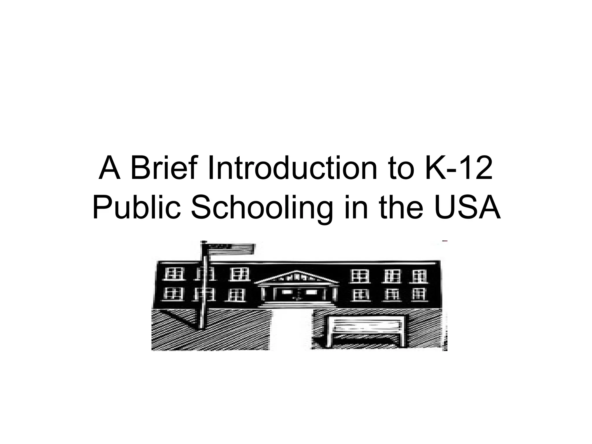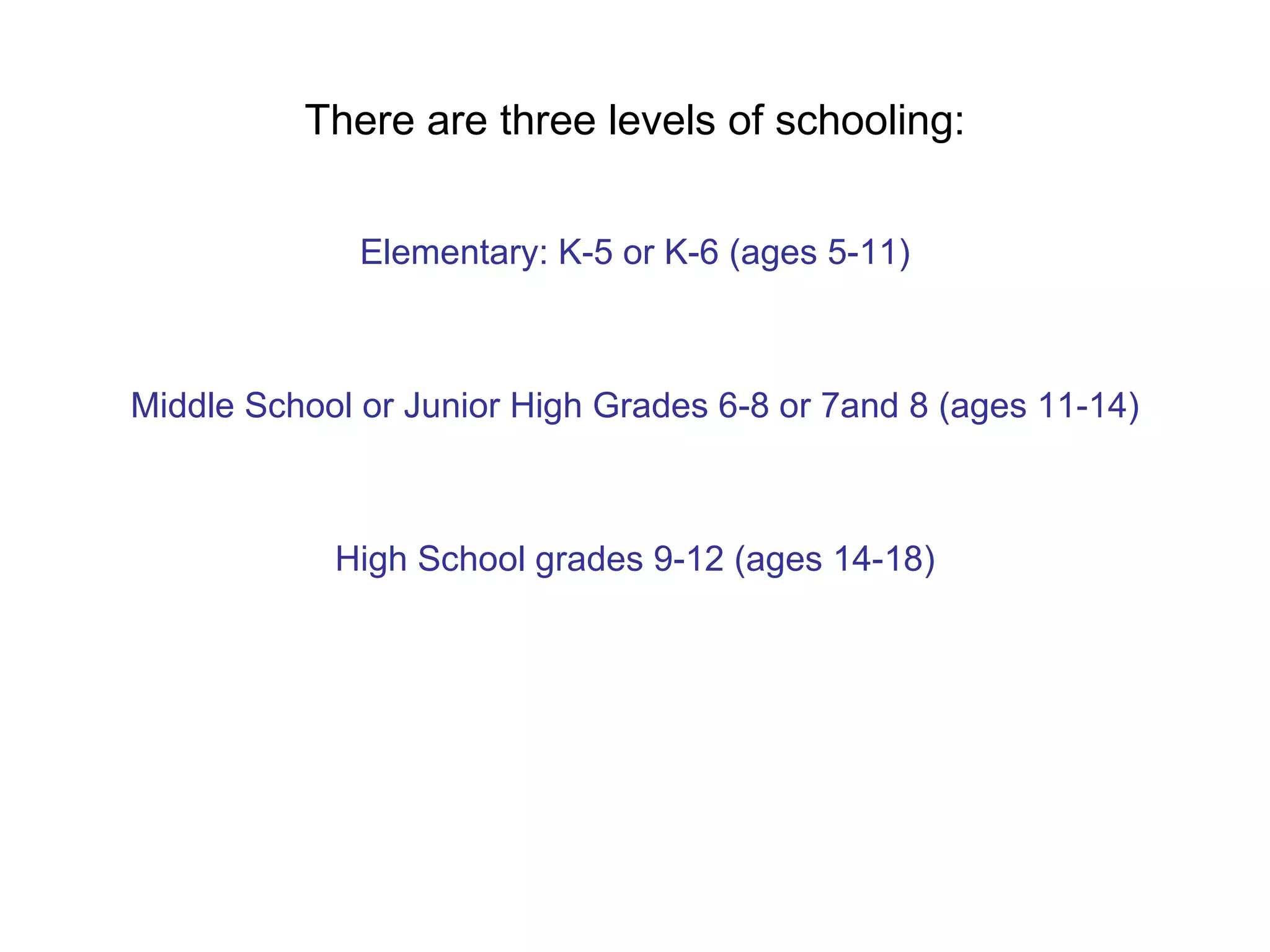 There are three levels of public schooling in the USA: elementary (K-5 or K-6), middle/junior high (6-8 or 7-8), and high school (9-12). Students graduate from each level, often with ceremonies, photographs, and gifts. Schools provide required textbooks while students supply other materials. Schools offer extracurricular activities and punishments like detention for infractions. Elementary students remain in one classroom, middle schools have periods/teachers for each subject, and high schools have more flexibility and special events like prom. Some are homeschooled or drop out, pursuing a GED later.