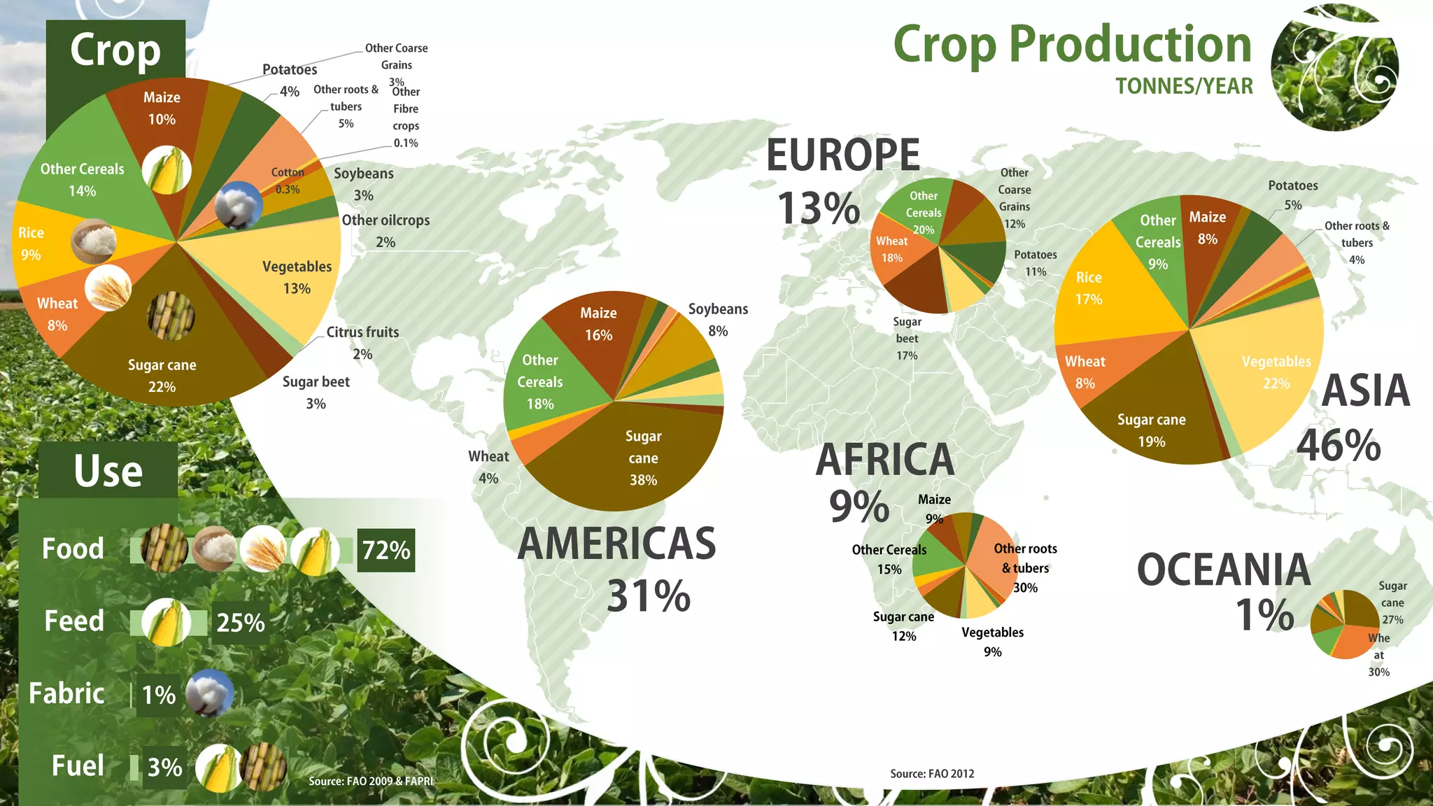 This document shows graphs of the yield per hectare from 1961 to 2009 for several key crops like maize, potatoes, rice, soybeans and wheat. The yields for all crops have increased significantly over this period. A second graph shows the global supply of calories per person per day from major food sources like maize, potatoes, rice, soybeans and wheat, which has also risen considerably since 1961 according to the food supply quantity data.