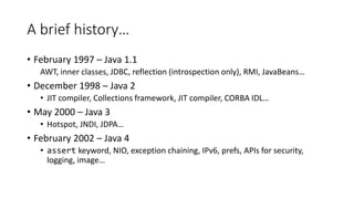 This document provides a summary of modern Java features introduced between Java 1.1 and Java 8. Some key updates include lambda expressions and method references in Java 8 that allow for more concise functional-style programming. Java 8 also introduced default methods in interfaces, streams for functional-style collections operations, and Date-Time API improvements. Other additions were parallel processing support, CompletableFuture for asynchronous non-blocking code, and Nashorn JavaScript integration. Java 9 will focus on a new module system.