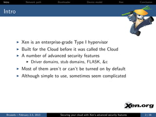 The document discusses the advanced security features of the Xen hypervisor, including driver domains, pvgrub, and stub domains, emphasizing the importance of understanding these features to secure cloud environments. It also outlines various attack surfaces and security considerations, such as threat models and best practices for implementing security measures. Ultimately, it aims to equip users with knowledge on managing security effectively within Xen architectures.