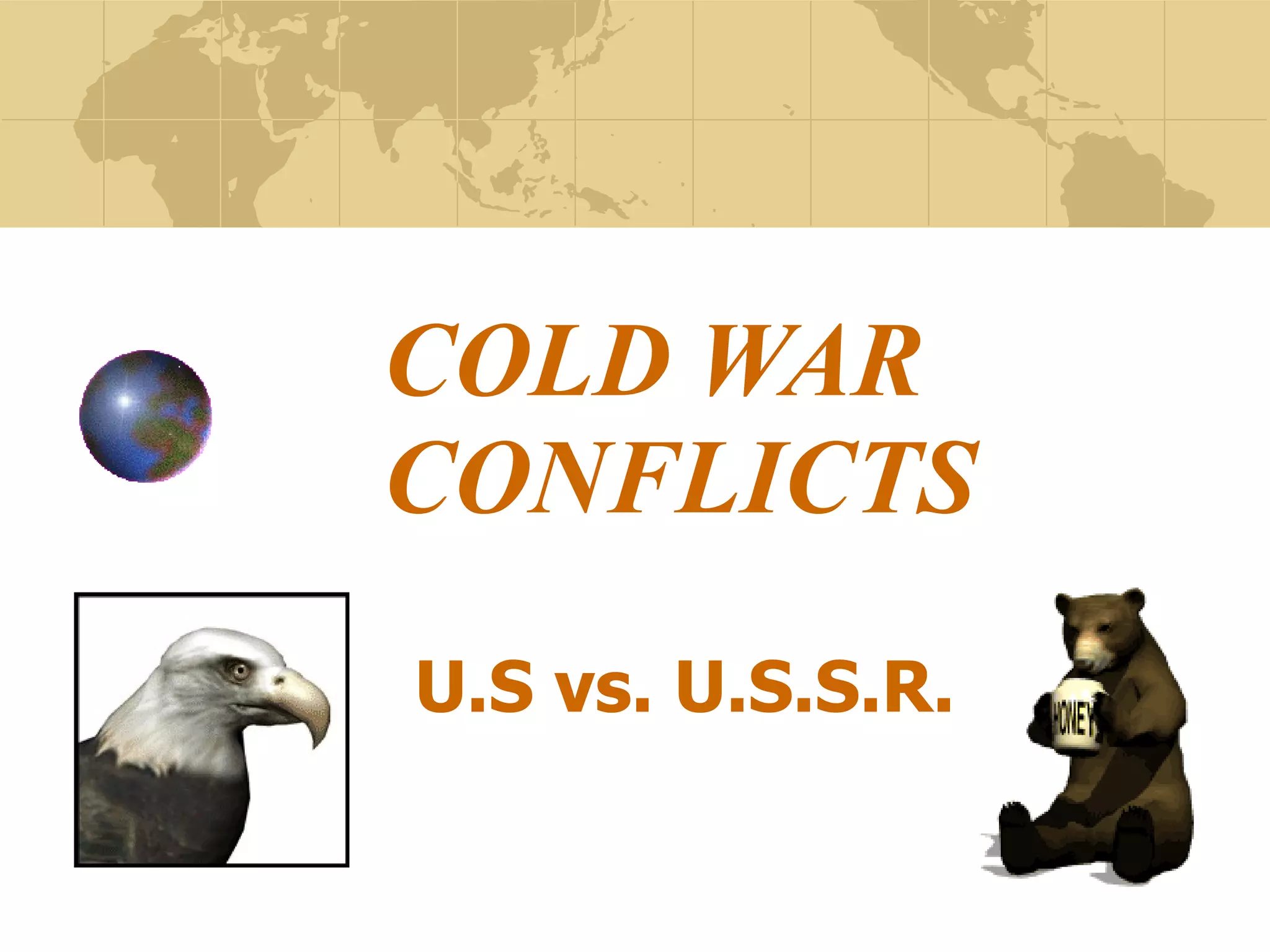 The document provides an overview of the origins and key events of the Cold War between the United States and Soviet Union from 1945 to the early 1960s. It discusses the ideological differences that emerged after WWII, the tensions that developed during the war, and the establishment of political spheres of influence in Europe that divided it. It then outlines several flashpoints and proxy conflicts that heightened tensions, including divisions in Germany and Korea, espionage scandals, and arms races in nuclear weapons and space.
