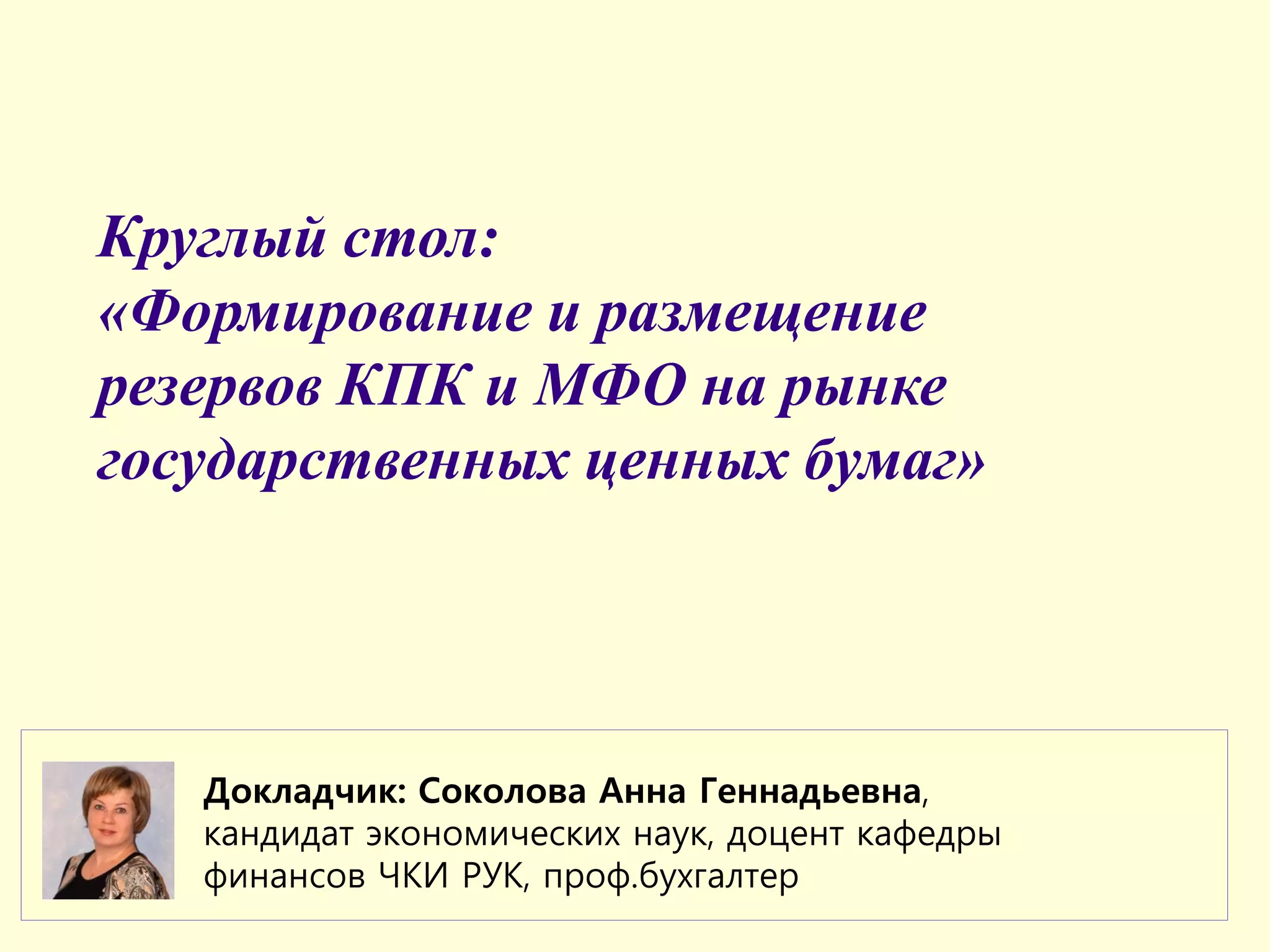 Доклад под руководством Соколовой Анны Геннадьевны рассматривает формирование и размещение резервов в кредитных потребительских кооперативах и микрофинансовых организациях на рынке государственных ценных бумаг. Основное внимание уделяется учетным аспектам, нормативным документам и процедурам создания резервов, а также расчету амортизированной стоимости займов. Обсуждаются бухгалтерские записи, требования к отчетности и условия формирования резервов, а также резервного фонда.