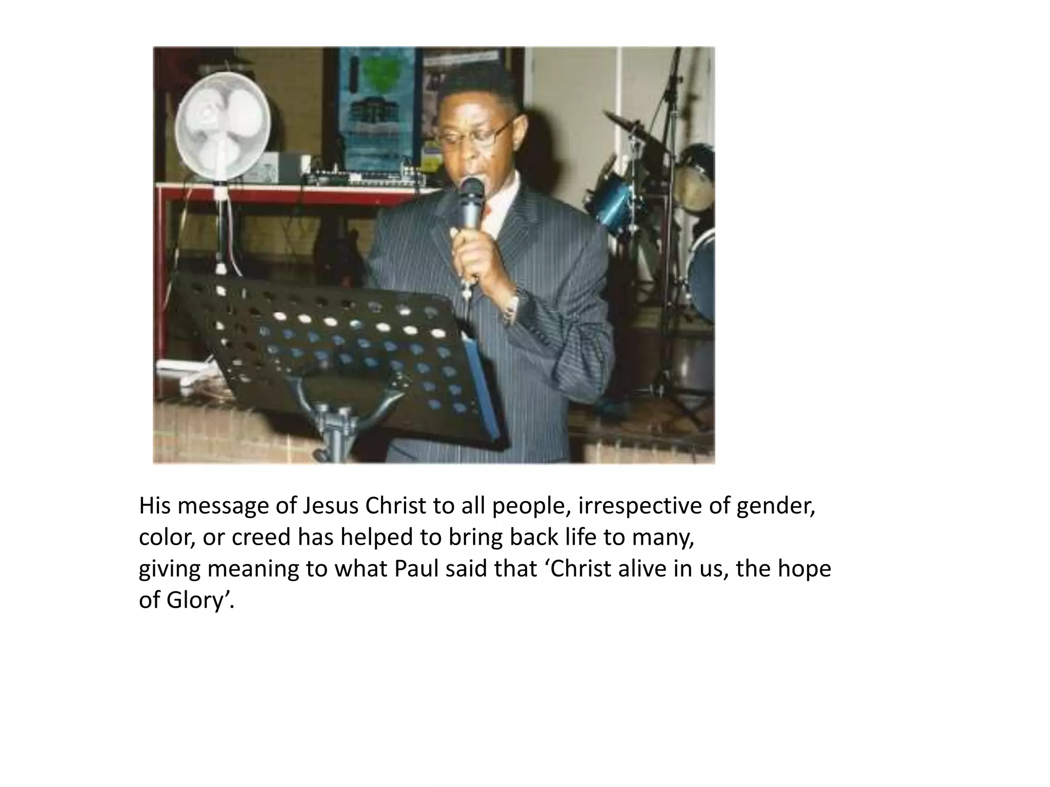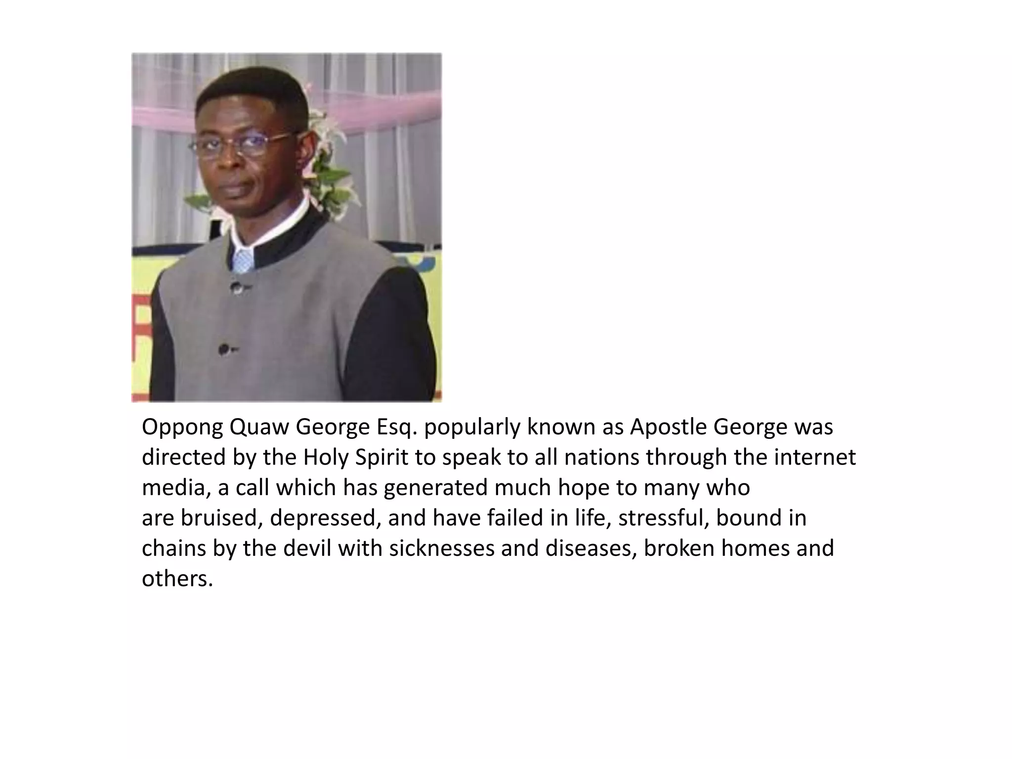 Apostle George Esq., known as Apostle George, was directed by the Holy Spirit to preach the gospel of Jesus Christ to all nations through internet media. He believes helping the poor, needy, and oppressed can eliminate problems in the world. Apostle George has dedicated his life to preaching salvation through Christ, prayer, and helping organizations like an orphanage in Rwanda. His own life story of overcoming struggles and finding purpose in God is told in his autobiography "Trading my Sorrows".