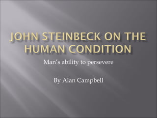 The document discusses mankind's ability to persevere through hardship. It references John Steinbeck's works like The Grapes of Wrath that illustrated the human struggle to survive difficult conditions like the Dust Bowl era when farming land became unusable. The works show how people's lives were upended and they struggled for survival, with some leaving everything behind to head to unknown places like California in search of work.