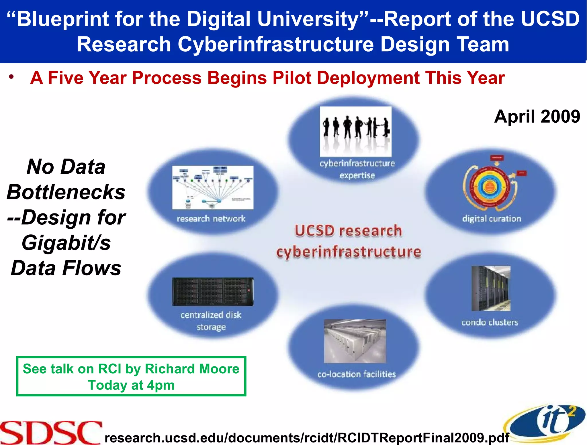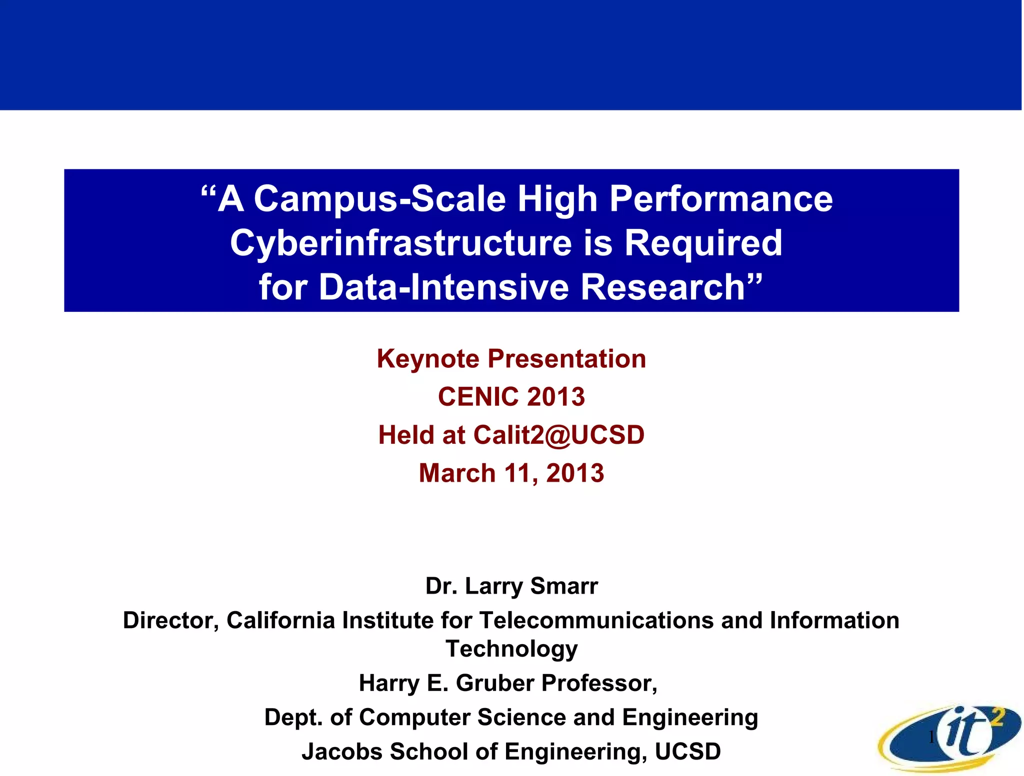 This document discusses the need for a campus-scale high performance cyberinfrastructure at UCSD to support data-intensive research. It notes that various research projects on campus, such as those related to particle physics, climate modeling, ocean observing, and microscopy, generate massive amounts of data and require high-speed connections both on campus and to remote resources. It highlights several projects that have implemented dedicated 10 Gbps connections but notes that bandwidth needs continue growing rapidly. The document argues that affordable 10 Gbps networking across the entire campus is now possible and would support data-driven collaborative research.