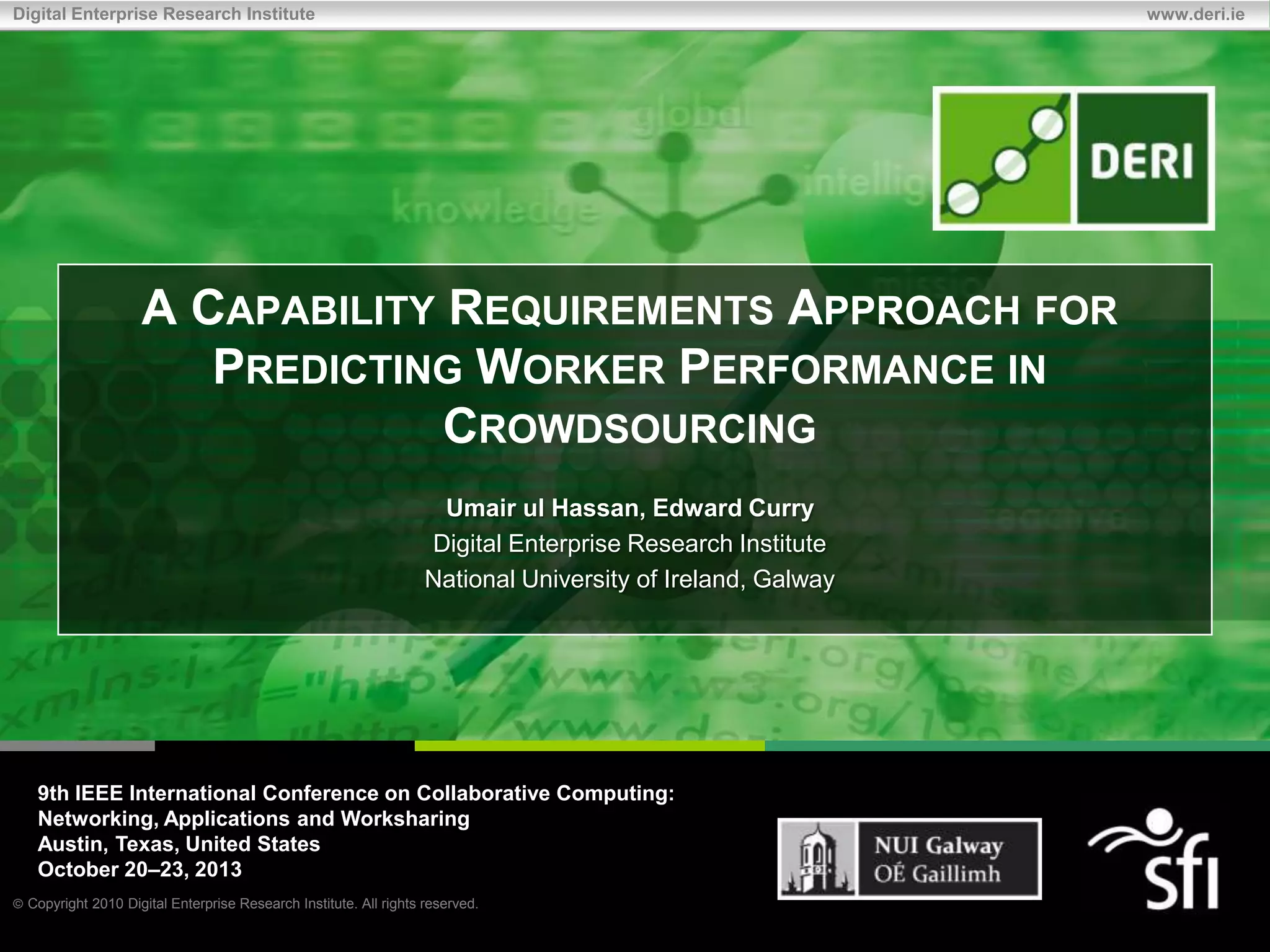 The document discusses a capability requirements approach for predicting worker performance in crowdsourcing, emphasizing the importance of effectively assigning tasks to workers based on their capabilities. It introduces a capabilities taxonomy and capability tracing model to evaluate and predict worker performance on various micro-tasks. Future work aims to expand evaluations across more task types and develop standard tests for measuring worker capabilities.