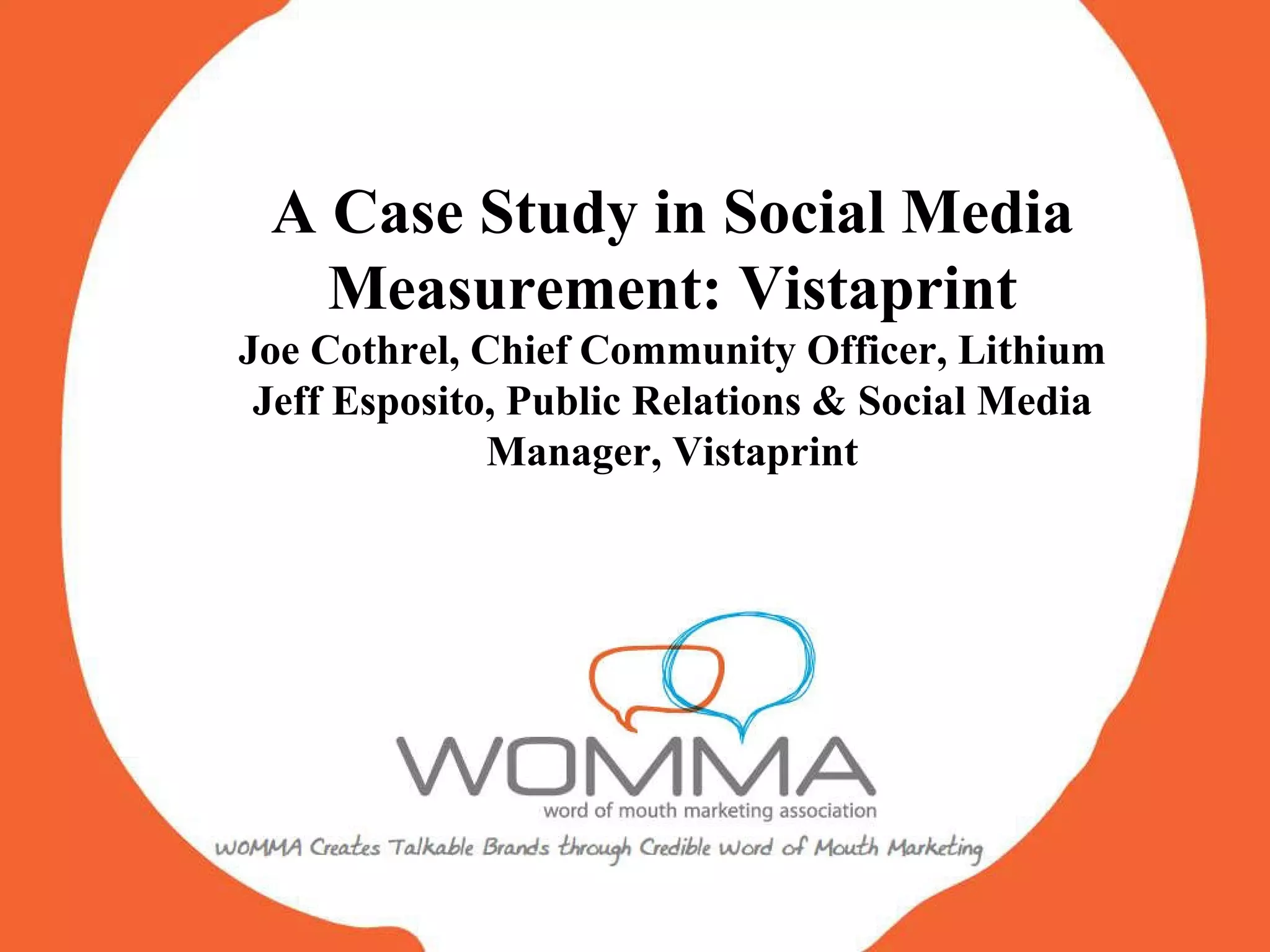 This case study explores Vistaprint's approach to social media measurement, highlighting the evolution of their metrics and the impact on business outcomes. Key performance indicators include audience engagement, revenue generation, and overall social influence, with a focus on listening and responding to customer interactions. The document emphasizes the importance of aligning social media efforts with business goals and effectively measuring success.