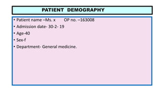The case study details a 40-year-old female patient diagnosed with typhoid fever, presenting symptoms of persistent fever, abdominal pain, and burning micturition. Laboratory tests confirmed the diagnosis, and a treatment regimen involving paracetamol, ceftriaxone, metronidazole, and ranitidine was prescribed. Patient counseling emphasized avoiding contaminated food and water, regular handwashing, and the importance of maintaining hygiene to prevent further infections.