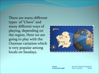 Chave is a traditional Galician game popular in Ourense, played by two teams of two players each, using a cylindrical iron disk called a 'pello.' The objective is to hit a central target known as the 'chave,' with points awarded for direct hits and proximity to the target. The game is played on a flat clay or grass surface, and the winner is the first team to score 30 points or a predetermined amount.