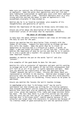 Dickens uses description of three characters - Scrooge, Fezziwig, and the Ghost of Christmas Present - to show different Victorian attitudes towards the poor. Scrooge embodies the selfish rich and ignores the poor, while Fezziwig generously cares for his employees' well-being. The Ghost teaches Scrooge compassion and the importance of addressing social ills like ignorance and poverty. Through these characters, Dickens conveys his view that the Christmas spirit of goodwill and charity should last throughout the year.