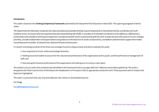 The document outlines the Clerking Competency Framework Audit designed for governing boards in maintained schools, academies, and multi-academy trusts, emphasizing the critical role of professional clerking in effective governance. It details competencies expected of clerks, including understanding governance, administration, and effective communication, alongside a structured self-review toolkit for evaluating clerking performance. The framework aims to enhance accountability, transparency, and collaboration within school governance, ultimately improving educational outcomes.
