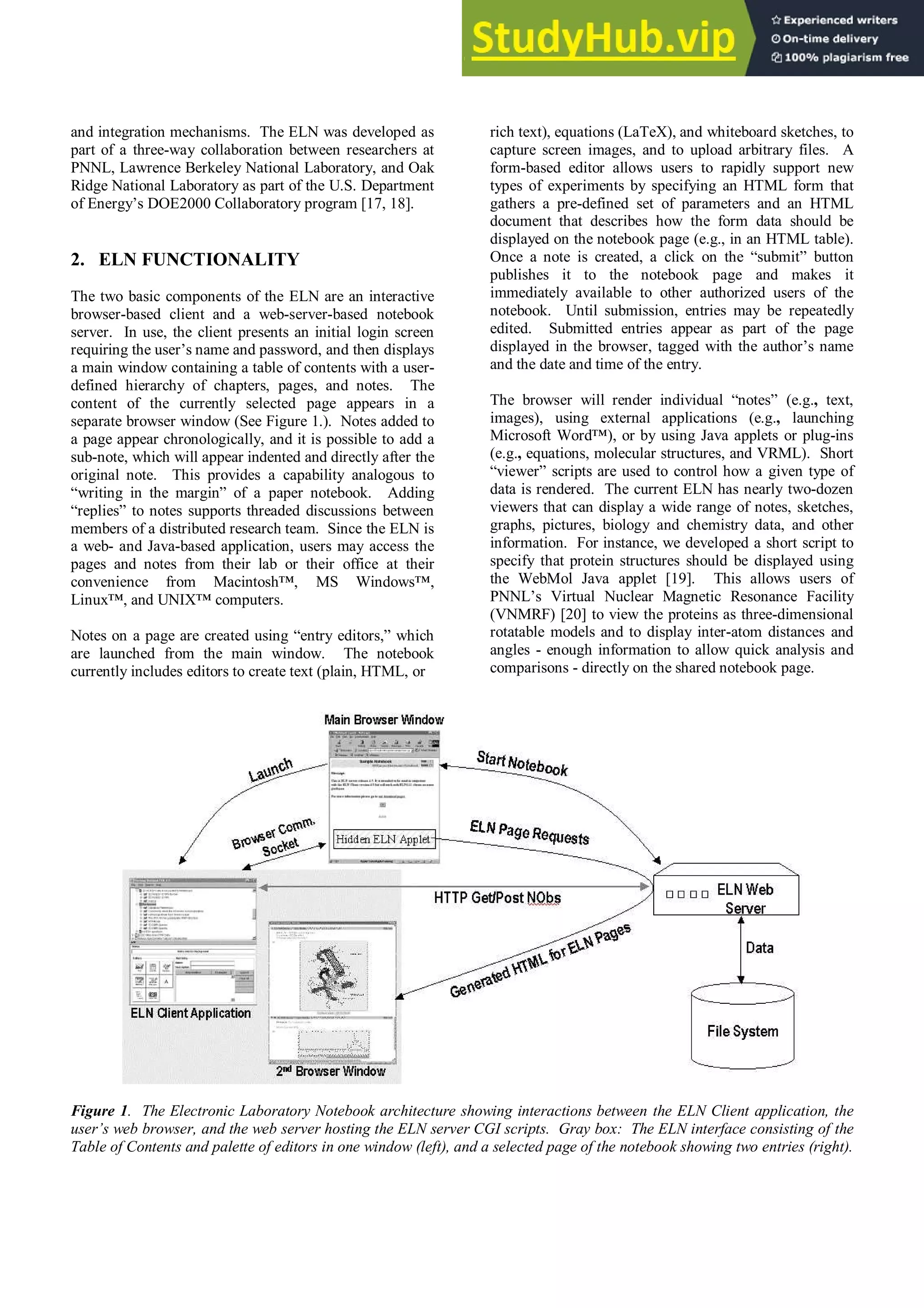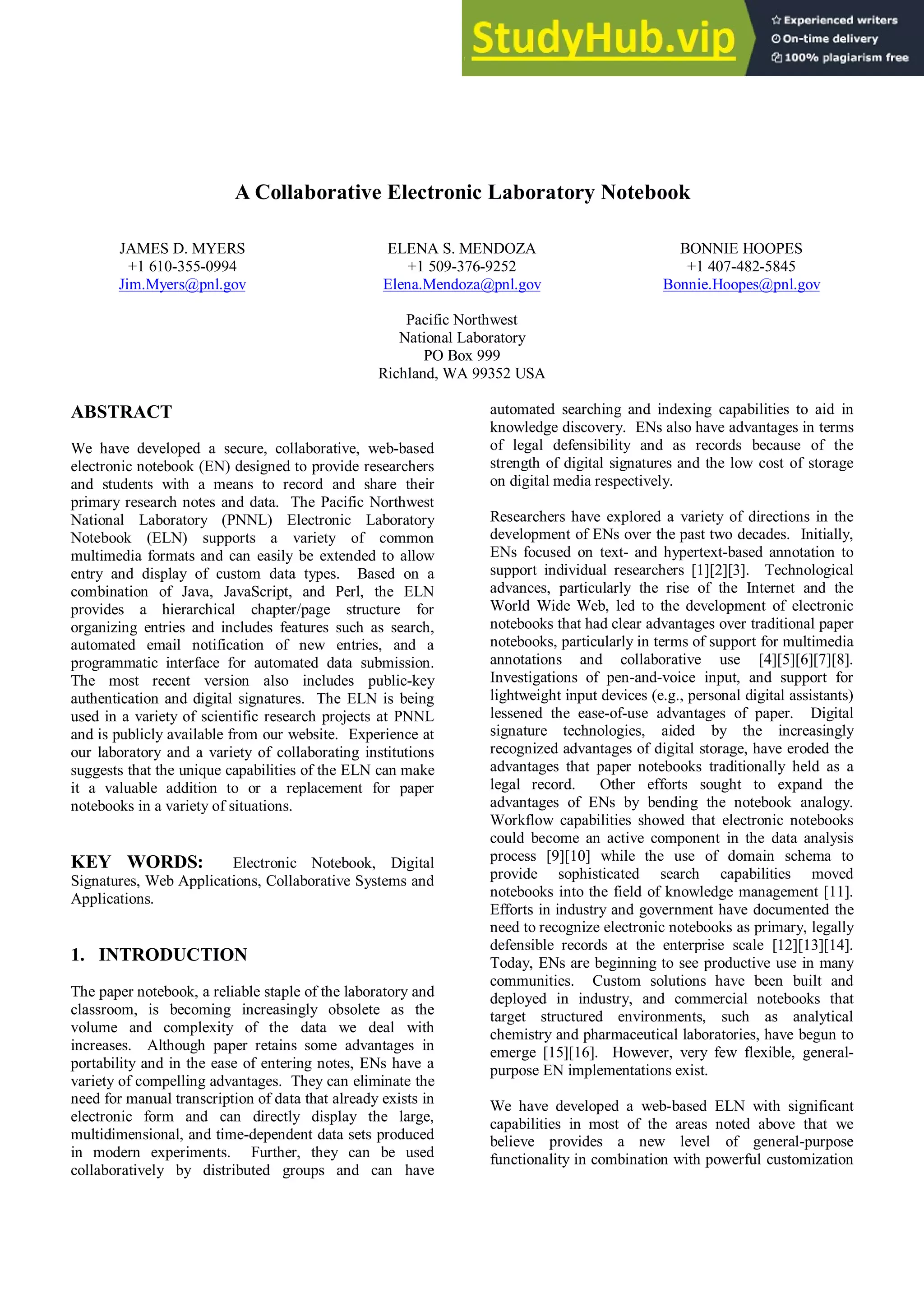 This document summarizes a collaborative electronic laboratory notebook (ELN) developed by researchers at Pacific Northwest National Laboratory. The ELN allows researchers to securely record and share primary research notes and data in a variety of formats. It provides a hierarchical chapter/page structure, search capabilities, email notifications, and can be customized for specific projects/disciplines. The ELN has been used successfully by over 600 users for collaboration, capturing multimedia notes, and as a primary research record. While useful, electronic notebooks still need improvements to fully replace paper notebooks, including better support for complex relationships between entries and integration with scientific workflows.