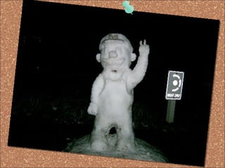 While most snowmen are peaceful, some can be murderous. The document notes that snowmen are typically associated with men, though there are notable snowwomen that are often overlooked. It goes on to show various snow sculptures that were built, including a large snowman with tree trunk arms, snowmen hanging out with friends, impressive snow sculptures, and the document states that snowmen, snowwomen, and snow dinosaurs are welcome but not snow fish.