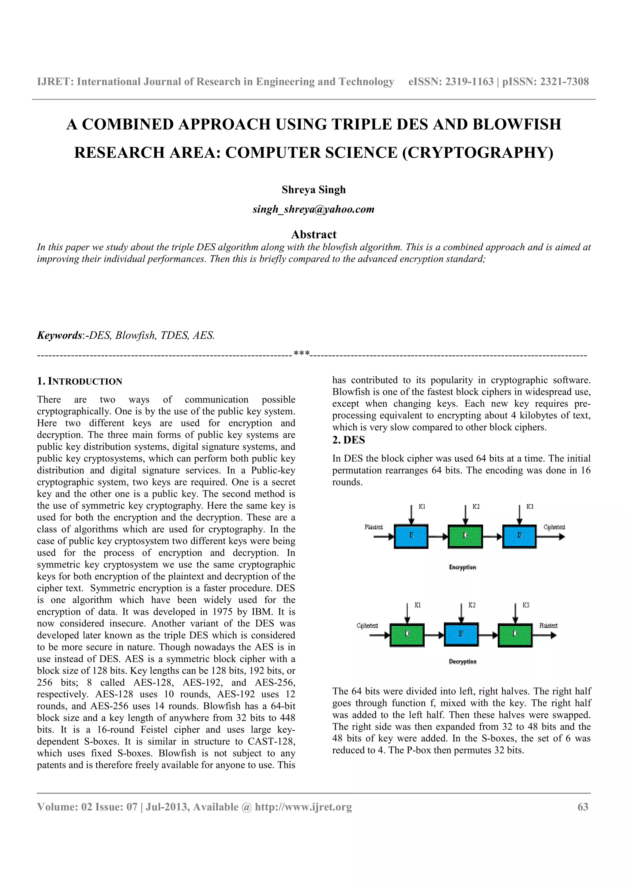 This document discusses a combined approach utilizing the Triple DES and Blowfish algorithms to enhance cryptographic performance. It outlines the features and operations of both algorithms, detailing their strengths and weaknesses in comparison to the Advanced Encryption Standard (AES). The conclusion highlights that the integration of Triple DES for security and Blowfish for speed results in an effective encryption solution.