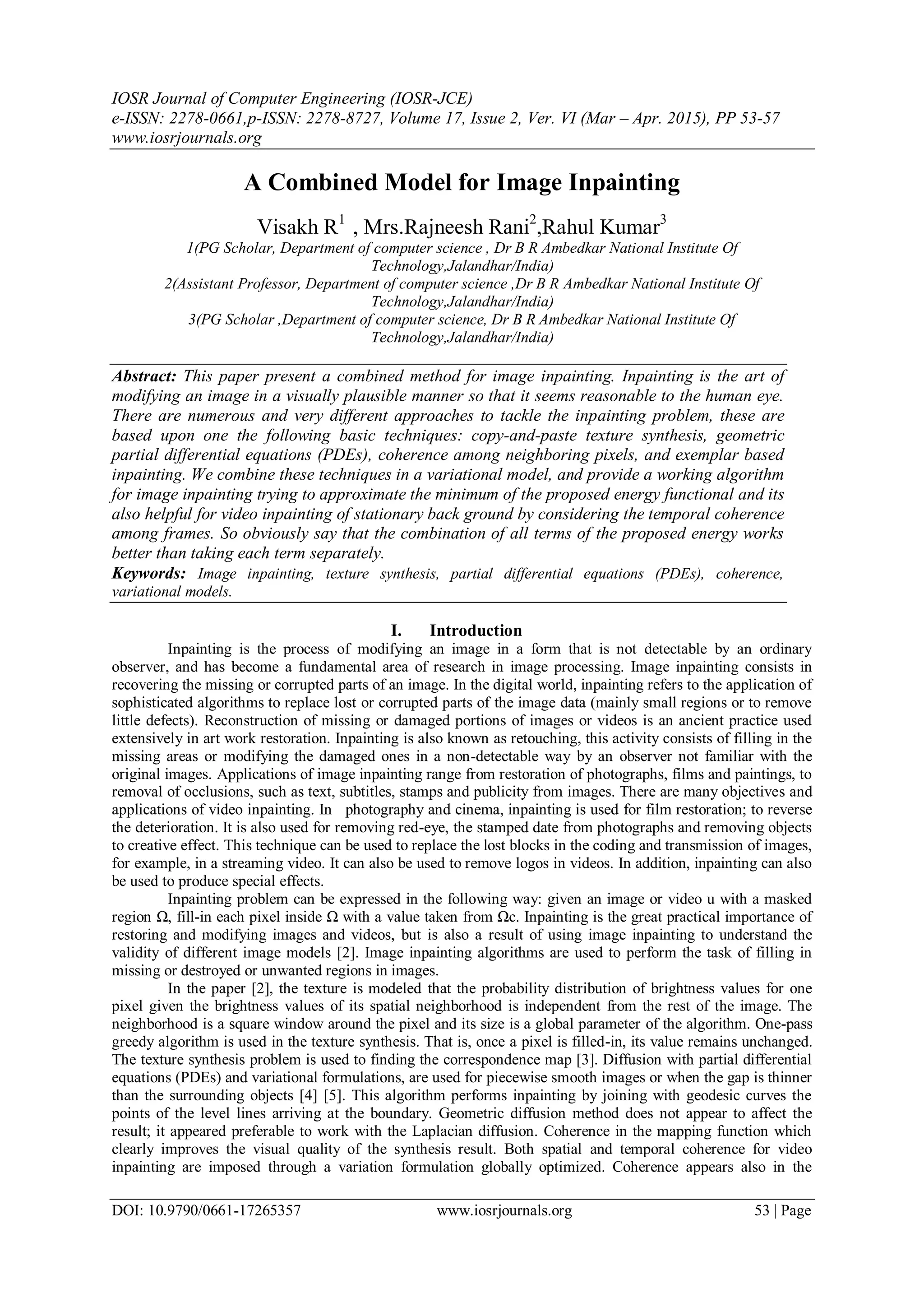 The paper presents a combined model for image inpainting that integrates various techniques such as texture synthesis, geometric partial differential equations (PDEs), and coherence among neighboring pixels. The proposed method aims to minimize an energy functional through an iterative algorithm that enhances the visual quality of inpainted images while efficiently handling computational costs. The results indicate that this combined approach outperforms individual techniques in terms of performance and effectiveness.