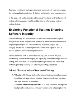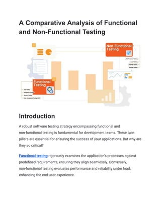 The document discusses the importance of both functional and non-functional testing in software development, highlighting their unique roles in ensuring application quality. Functional testing focuses on whether software meets specified requirements, while non-functional testing evaluates aspects like performance and usability. The integration of both testing types is crucial for delivering high-quality, reliable software that enhances user satisfaction and adheres to industry standards.
