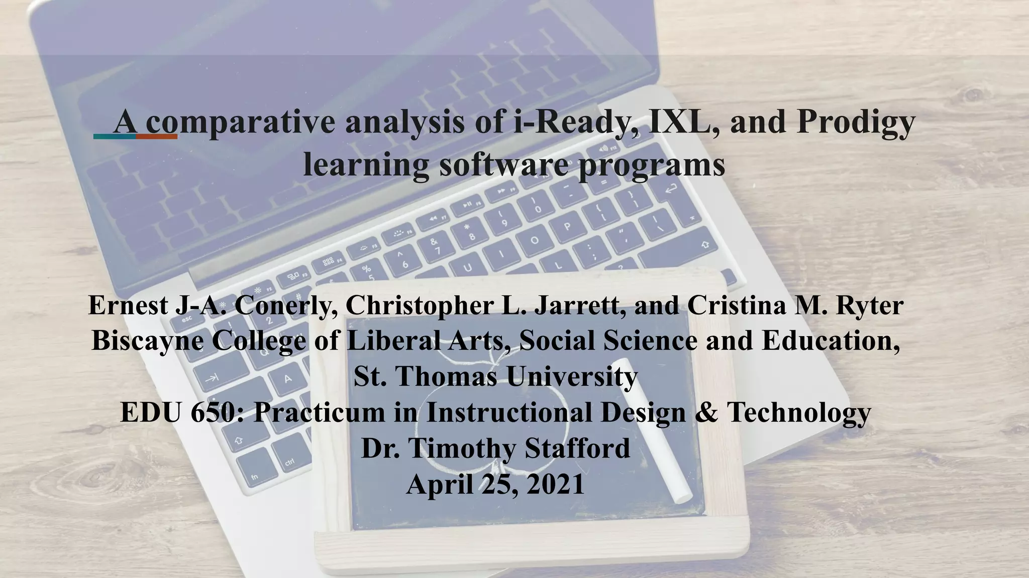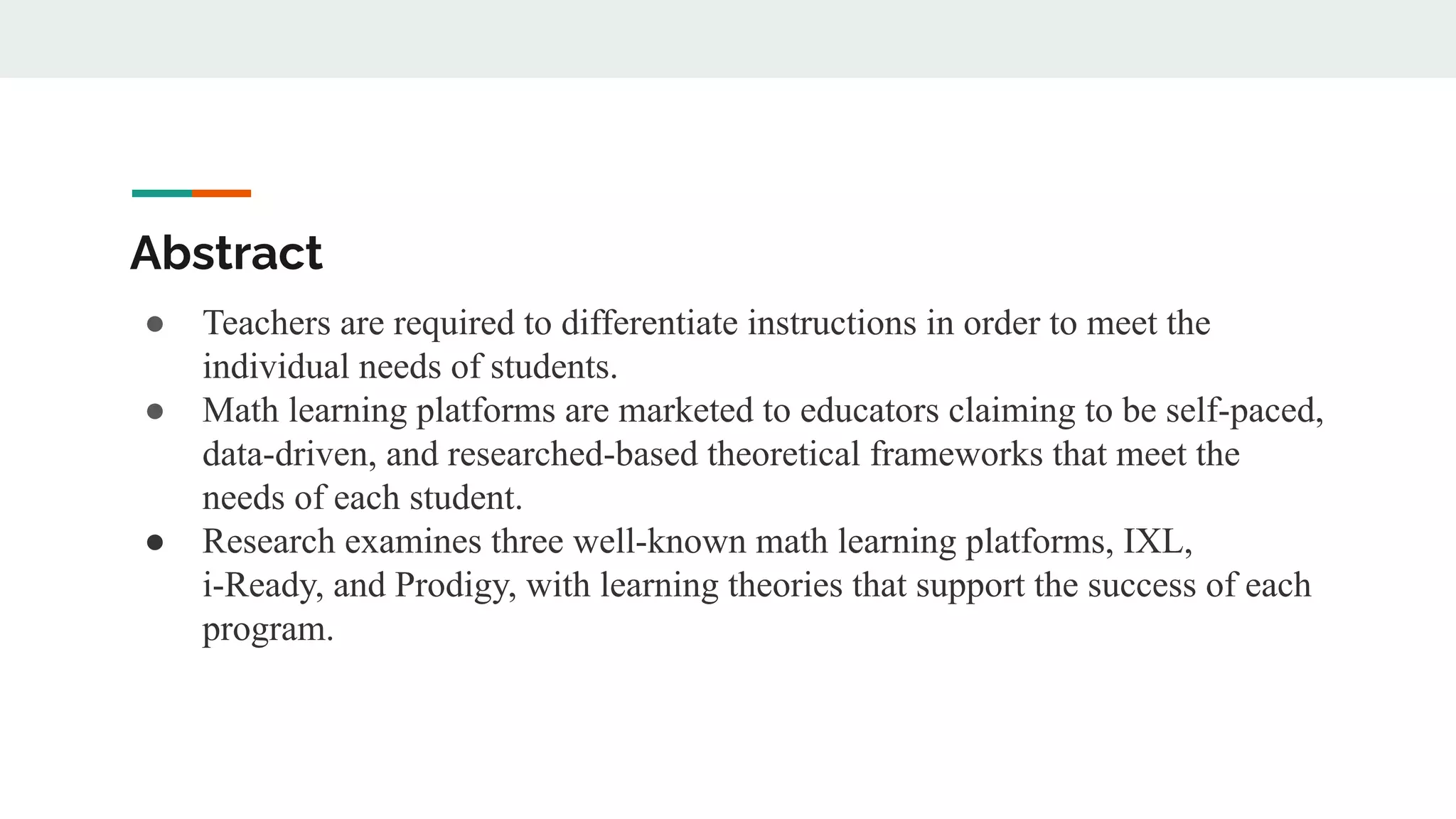 This document provides an abstract and introduction for a comparative analysis of the i-Ready, IXL, and Prodigy learning software programs. It examines these three programs and their effectiveness based on student performance on math portions of standardized assessments. The study aims to determine which program has the greatest impact on student growth and achievement. It reviews the relevant literature around the rise of educational technology and standardized testing.