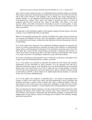 This document summarizes and compares several routing algorithms proposed for wireless sensor networks. It discusses algorithms that aim to improve reliability, power efficiency, lifetime, and fault tolerance. The evaluation section compares how each algorithm addresses challenges like reliability, energy conservation, and adapting to topology changes. While various algorithms achieve improvements in areas like power efficiency and lifetime, most still have limitations and do not fully address all the key challenges for wireless sensor networks.