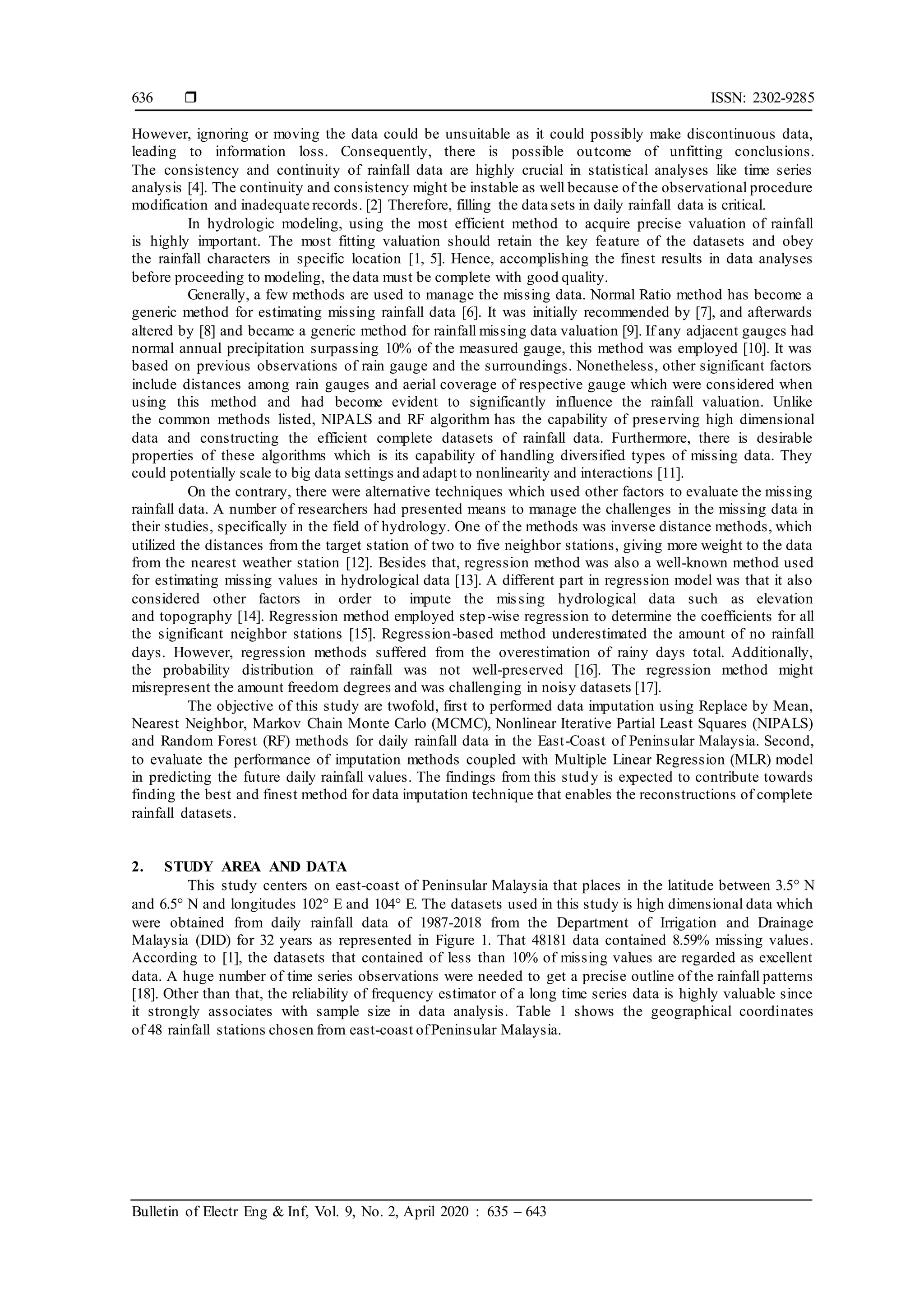 This study compares various imputation methods for daily rainfall data missing values in East Coast Peninsular Malaysia using data from 48 rainfall stations. Methods evaluated include mean substitution, nearest neighbor, random forest, non-linear iterative partial least squares (NIPALS), and Markov Chain Monte Carlo (MCMC), with performance assessed via multiple linear regression and statistical metrics like RMSE and MAE. The results indicate that the random forest combined with multiple linear regression is the most effective approach for addressing missing rainfall data in this region.