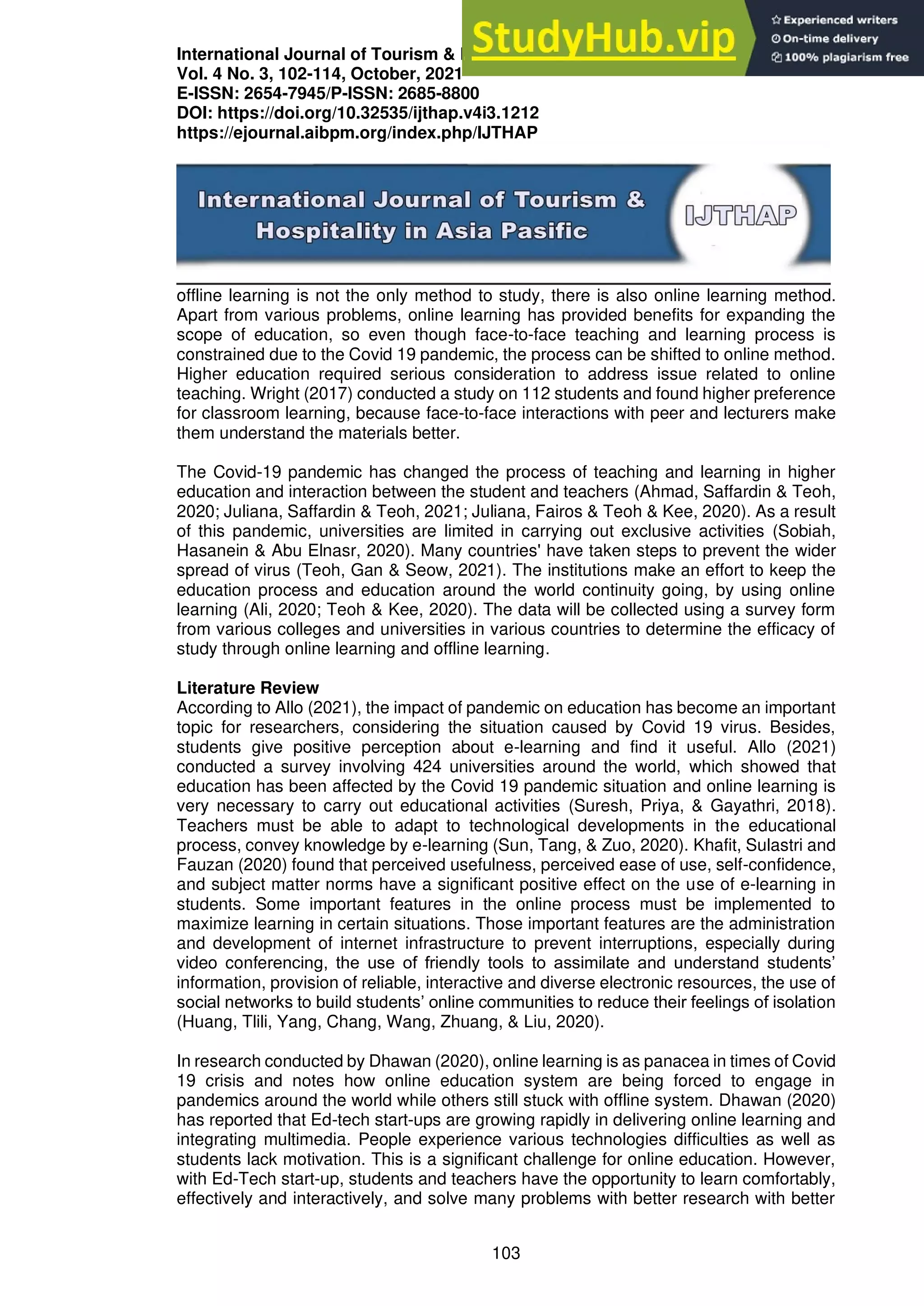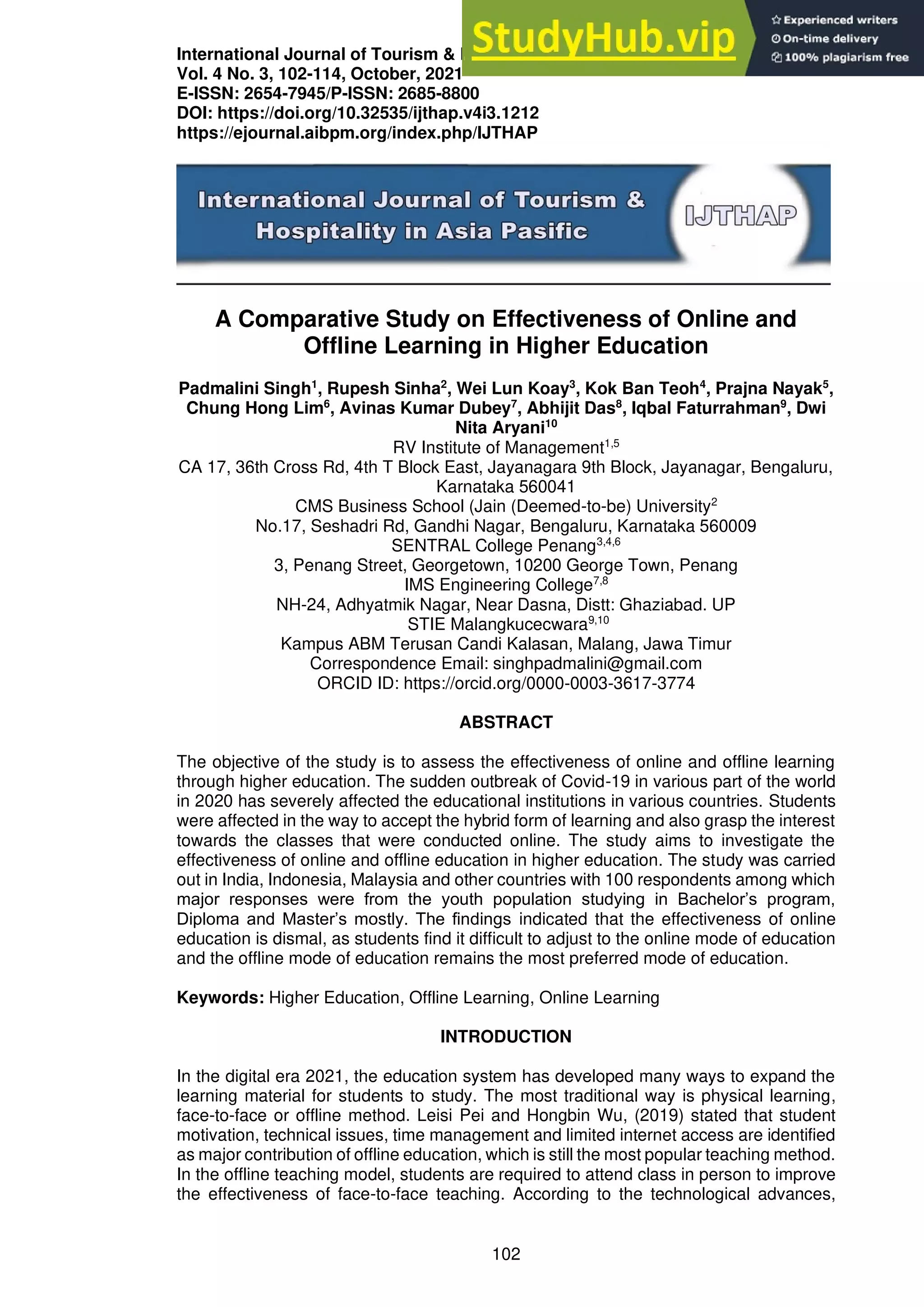 The document is a research paper that examines the effectiveness of online and offline learning in higher education. It conducted a survey of 100 respondents from India, Indonesia, and Malaysia studying in bachelor's, diploma, and master's programs. The findings showed that most respondents faced technical problems with online learning and found it difficult to adjust. While online learning provided some benefits like convenience, respondents overall preferred offline mode and felt it better supported understanding. The paper thus concludes that the effectiveness of online education is limited compared to traditional offline learning that remains the preferred approach for higher education.