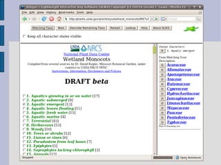 This document discusses and compares different types of interactive keys that can be used for species identification. It outlines the history of identification keys, requirements for interactive keys, popular software programs like Delta and Lucid, data formats, and recent developments that make keys more portable and enable online collaboration. The future of interactive keys lies in technological solutions that don't require lugging around heavy computers and can aggregate data from different sources online.