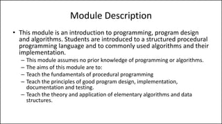This document provides an overview of a complete program design course that teaches programming, program design, and algorithms using pseudocode. The course assumes no prior knowledge and aims to teach fundamental programming concepts like procedural programming, good program design practices, and elementary algorithms and data structures.