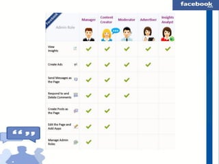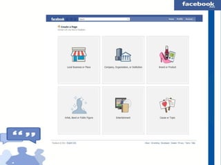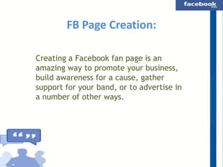 The document provides a comprehensive guide on creating a Facebook fan page for businesses, artists, and organizations, including setup details and various classifications. It covers Facebook ads, tools like Power Editor, Facebook Offers, and insights for managing page roles, as well as social plugins to enhance engagement. Resources and URLs for creating pages, ads, and tracking engagement are included throughout.