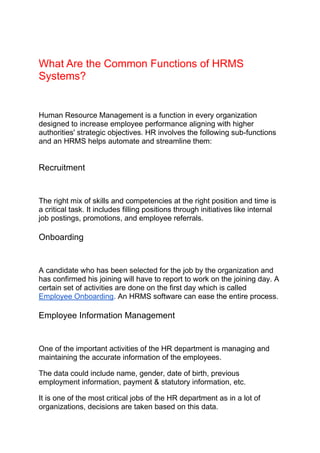 The document provides a comprehensive guide to Human Resource Management Systems (HRMS) for 2024, explaining their role in automating HR functions and improving efficiency. It outlines key features such as recruitment, onboarding, payroll processing, and employee engagement, emphasizing the benefits of using HRMS software for data management and cost-effectiveness. Additionally, it introduces SHRMPRO, an AI-based cloud HRMS solution designed to simplify HR operations for businesses of all sizes.