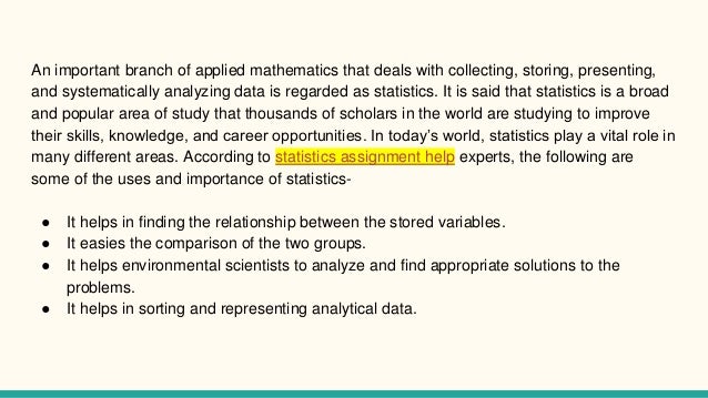 The document discusses the significance of statistics as an applied mathematics field that involves data collection, analysis, and presentation. It highlights various uses and branches of statistics, including descriptive, inferential, and regression statistics, and mentions top Australian universities offering courses in the subject. Additionally, it outlines the benefits of seeking statistics assignment help, such as 24/7 support, timely delivery, and affordable services.