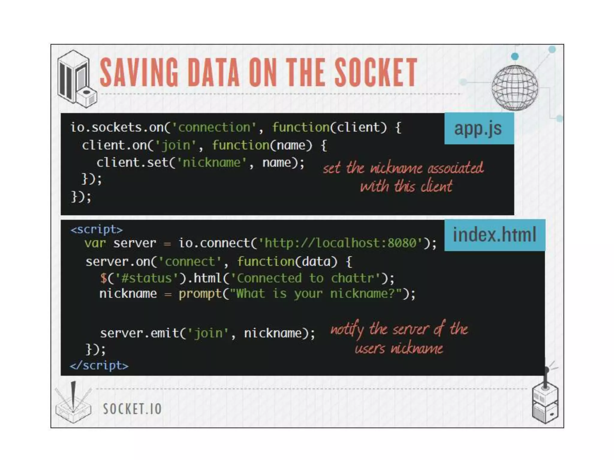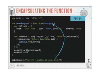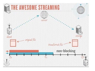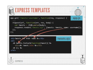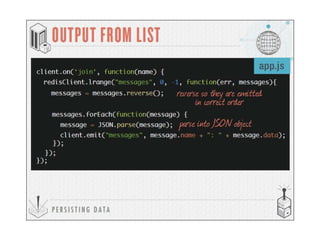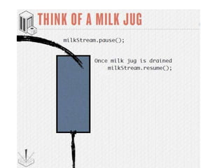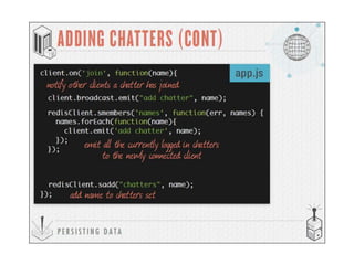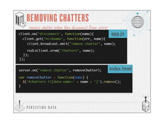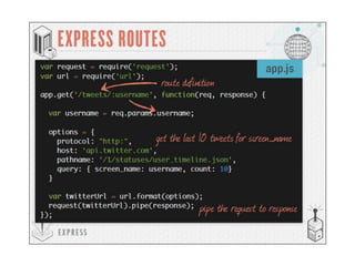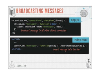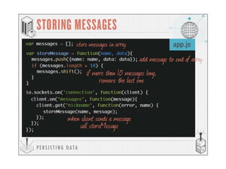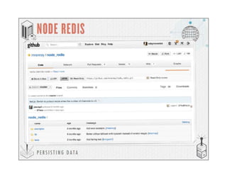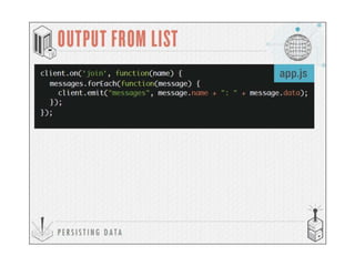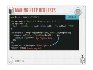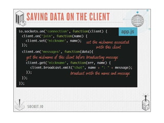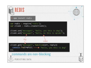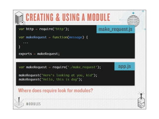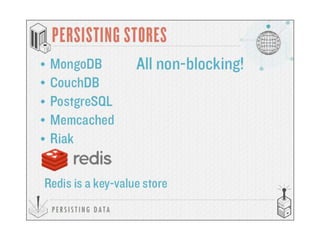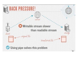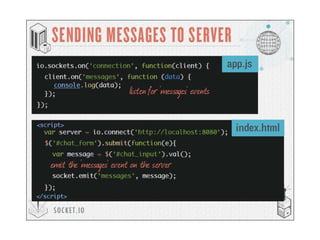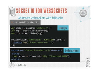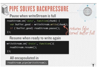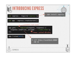 This document provides a complete guide to Node.js, covering installation methods, checking installation, modules, NPM, events, streams, and persisting data. It discusses installing Node.js from nodejs.org, using a version manager like NVM, or compiling from source. It also covers creating a basic web server, reading and writing files, uploading files, and using Socket.IO for real-time applications.