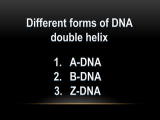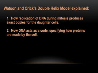 The discovery of the DNA double helix structure in 1953 by James Watson and Francis Crick was one of the greatest scientific achievements of the 20th century. They were able to determine that DNA consists of two strands coiled around each other to form a double helix. Each strand is made up of a backbone of alternating sugar and phosphate groups with nitrogenous bases protruding from the sugars. The bases on one strand form hydrogen bonds with complementary bases on the other strand. Watson and Crick's double helix model explained how DNA could replicate itself and be stable within organisms. Their discovery fundamentally changed our understanding of genetics and laid the foundation for modern molecular biology and genetic engineering.