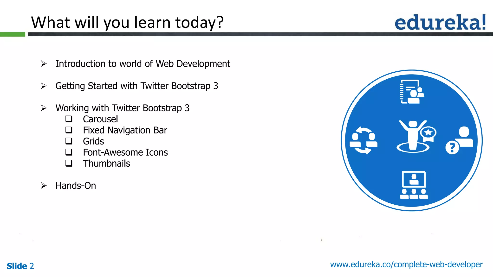 The document outlines the Edureka Complete Web Developer course, detailing topics such as web development fundamentals, Twitter Bootstrap components, and certification details. It emphasizes hands-on learning with practical applications of Bootstrap features like carousels, navigation bars, grids, thumbnails, and icons. The course includes live classes, assignments, and lifelong access with 24/7 support.