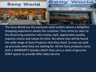 Sony World is a retail chain that exclusively sells Sony products. It aims to provide a delightful shopping experience for discerning customers seeking style, quality, variety and convenience. Sony World stocks the widest range of Sony products and accessories in India. All products come with a warranty and repair services. There are currently 50 Sony World stores across India, with 19 located in Mumbai. The stores aim to cater to customers between the ages of 14 to 55 years.