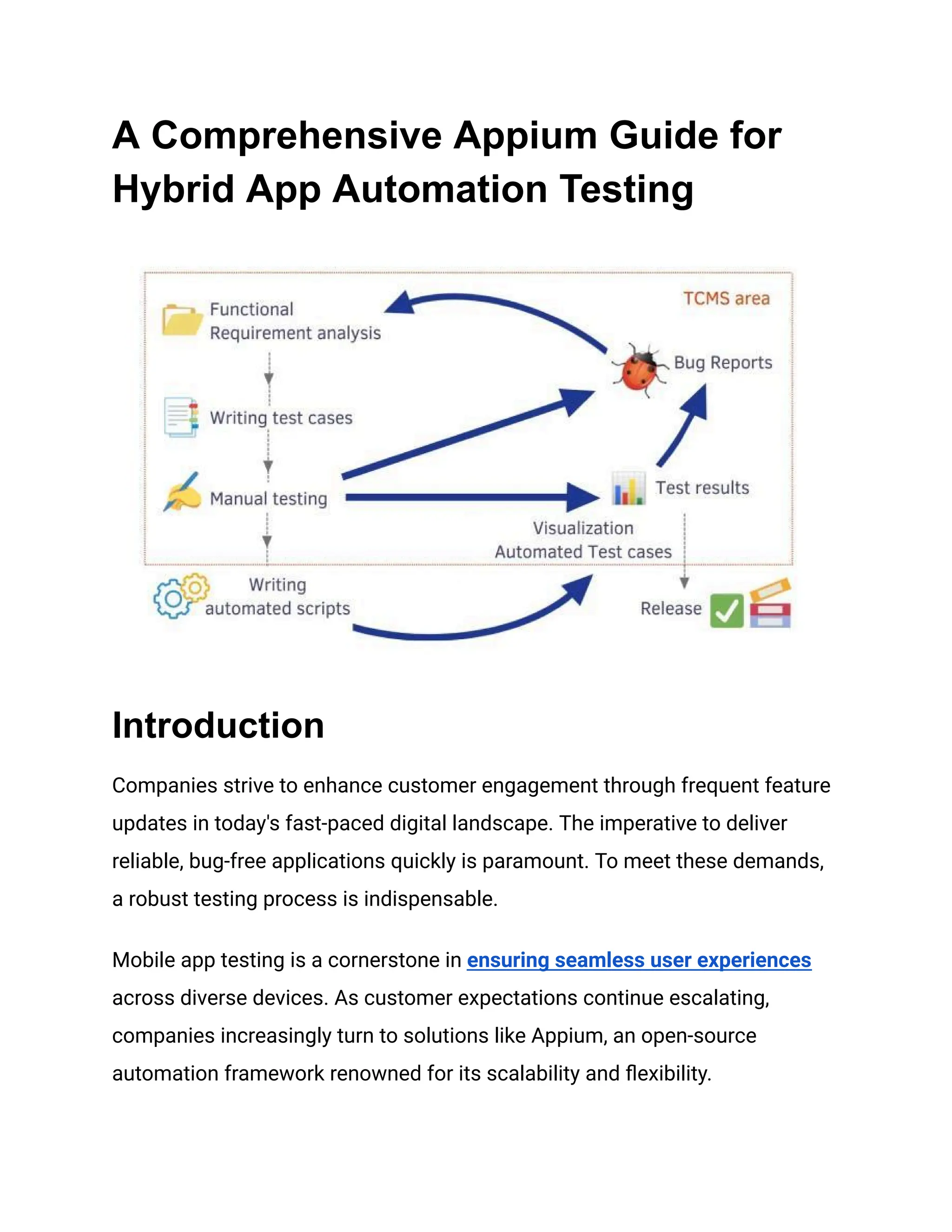 This document is a comprehensive guide on using Appium for hybrid mobile app automation testing, highlighting its features like cross-platform compatibility and support for popular programming languages. It details the architecture of Appium, prerequisites for automation, and provides step-by-step instructions for setting it up on Android and iOS platforms. The guide emphasizes the importance of Appium in delivering reliable applications rapidly and how its integration with Headspin enhances testing efficiency and scalability.