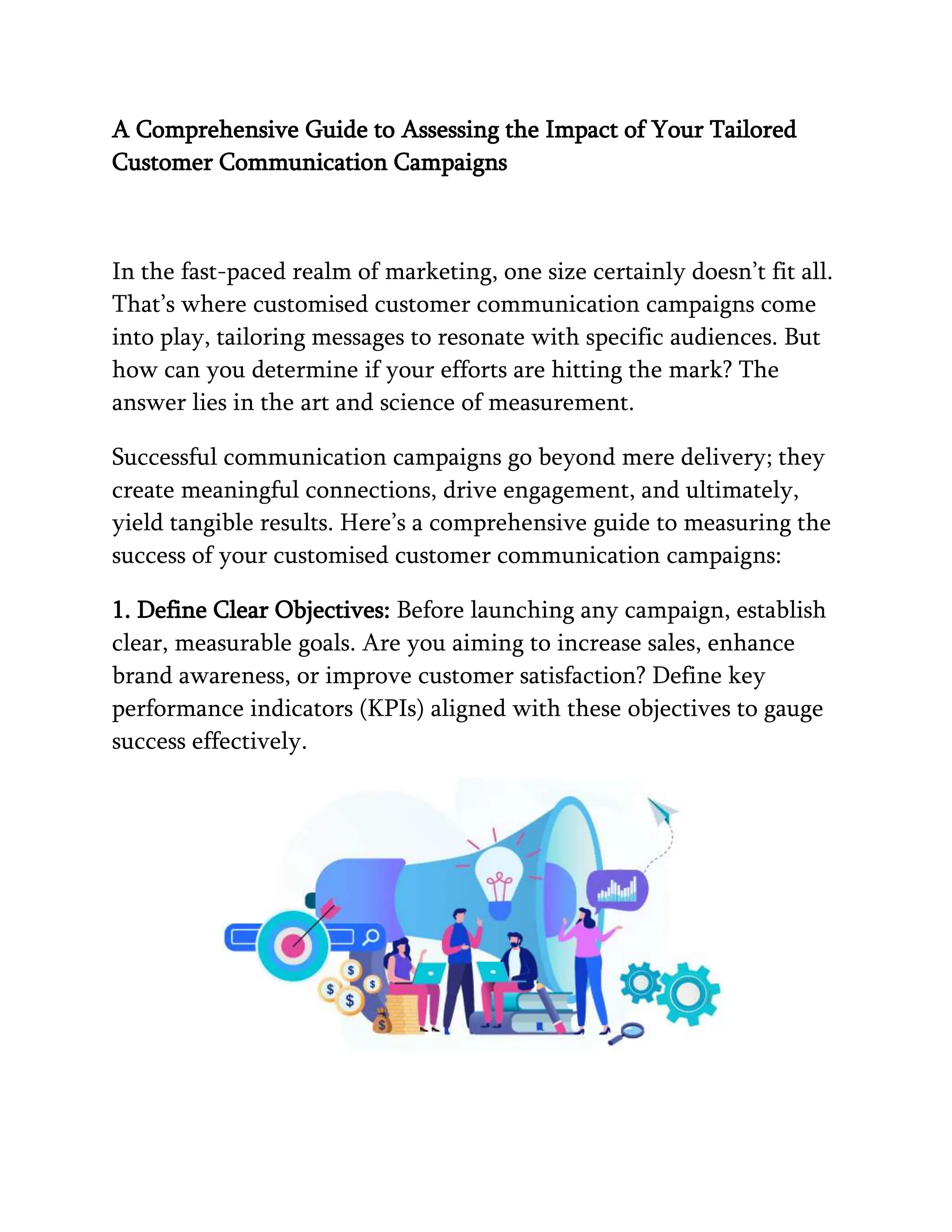 This document provides a comprehensive guide for assessing the impact of tailored customer communication campaigns in marketing. Key steps include defining clear objectives, analyzing audience segmentation, measuring engagement metrics, tracking conversion rates, and gathering customer feedback. Effective measurement not only evaluates success but also enhances customer experience and engagement.
