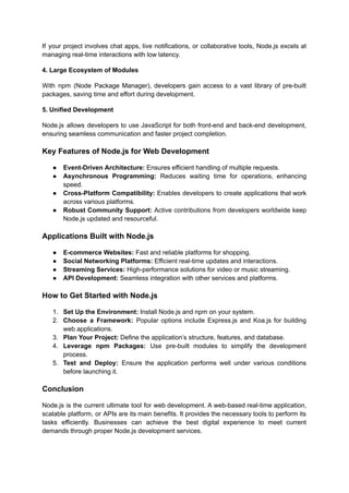 This document is a comprehensive guide to building websites with Node.js, highlighting its speed, efficiency, and suitability for real-time and scalable applications. It explains the advantages of Node.js, including its event-driven architecture, scalability, and extensive package ecosystem via npm. The guide also offers a step-by-step approach for getting started with Node.js development, emphasizing its impact on improving web development processes.