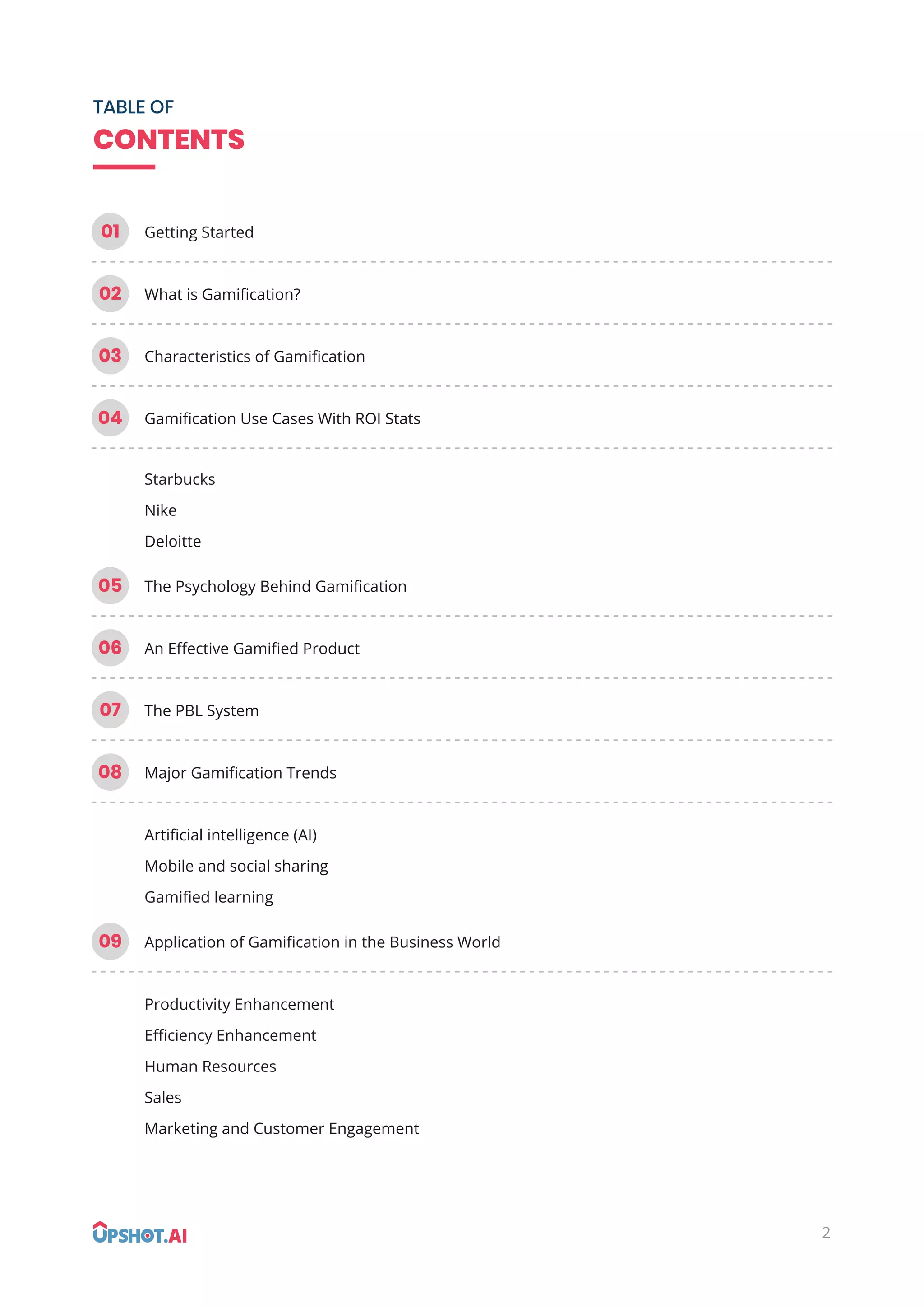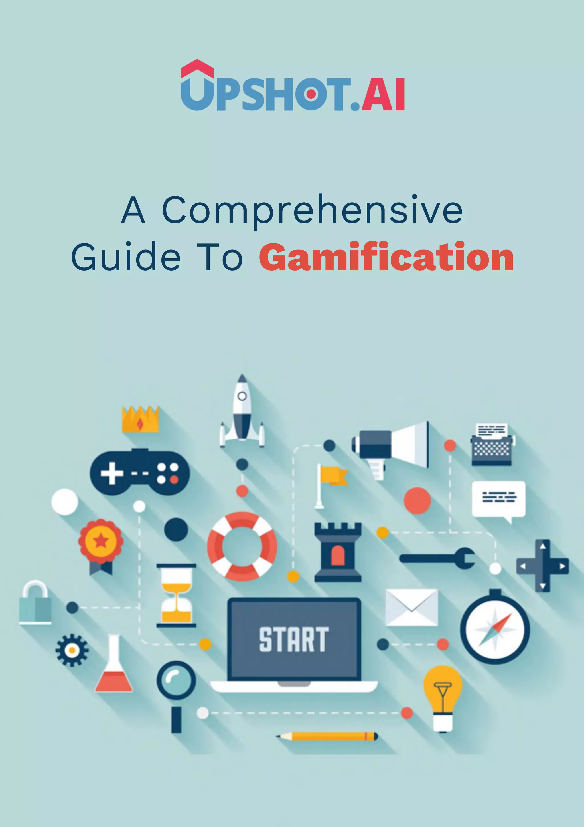 This document is a comprehensive guide to gamification, detailing its definition, characteristics, use cases, and psychological underpinnings. It emphasizes how gamification can enhance engagement and motivation in various business applications, such as marketing, human resources, and learning environments. The guide also outlines best practices for implementing gamification and provides a six-step design framework from upshot.ai for effective gamified product development.