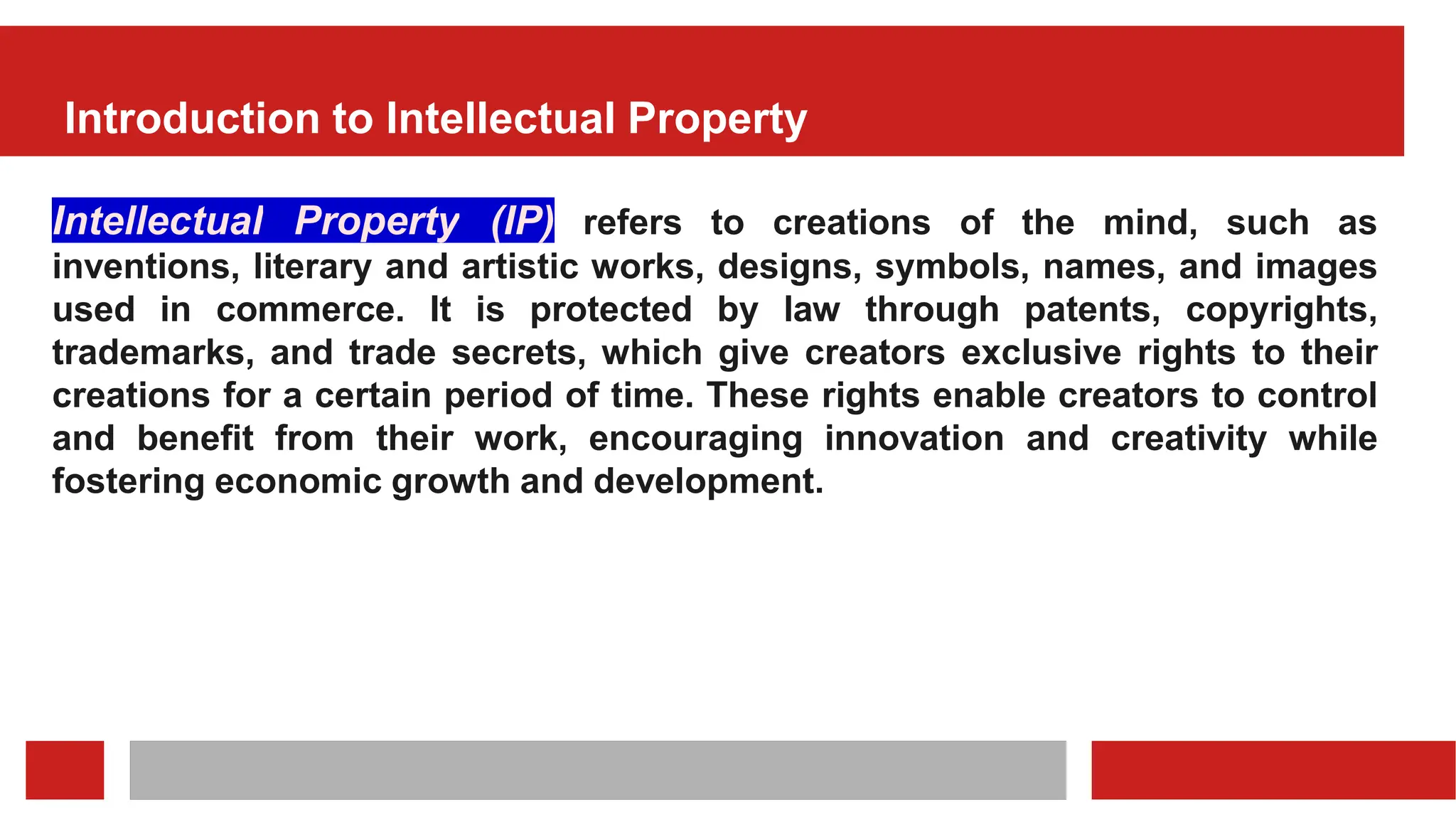 The document provides a comprehensive overview of intellectual property (IP), covering its definitions, types (patent, trademark, copyright, trade secret), and their significance in fostering innovation, creativity, and economic growth. It details the protection mechanisms for each type of IP, benefits, and examples of well-known protected works and inventions, highlighting the importance of IP in various industries. Furthermore, it discusses the processes involved in securing IP rights, emphasizing the need for legal protection to maintain competitive advantages in the marketplace.