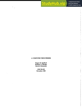 This document provides an overview of computer viruses, including their history, structure, and methods of spreading. It discusses how viruses work by copying their code into other programs. The document also offers recommendations for preventing and detecting viral infections, such as using antivirus software, implementing security policies, and regularly backing up files. It aims to introduce readers to the topic of computer viruses without excessive technical details.