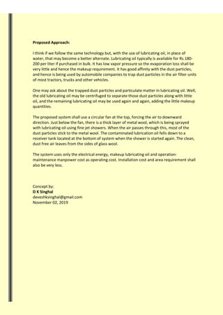 The document discusses the severe air pollution issue in Delhi-NCR and explores various control measures. It highlights past experiences such as the effectiveness of rain and the need to ban practices like stubble burning, while proposing an innovative solution using lubricating oil instead of water to filter dust from the air. The proposed system is efficient, cost-effective, and minimizes water usage while improving air quality.