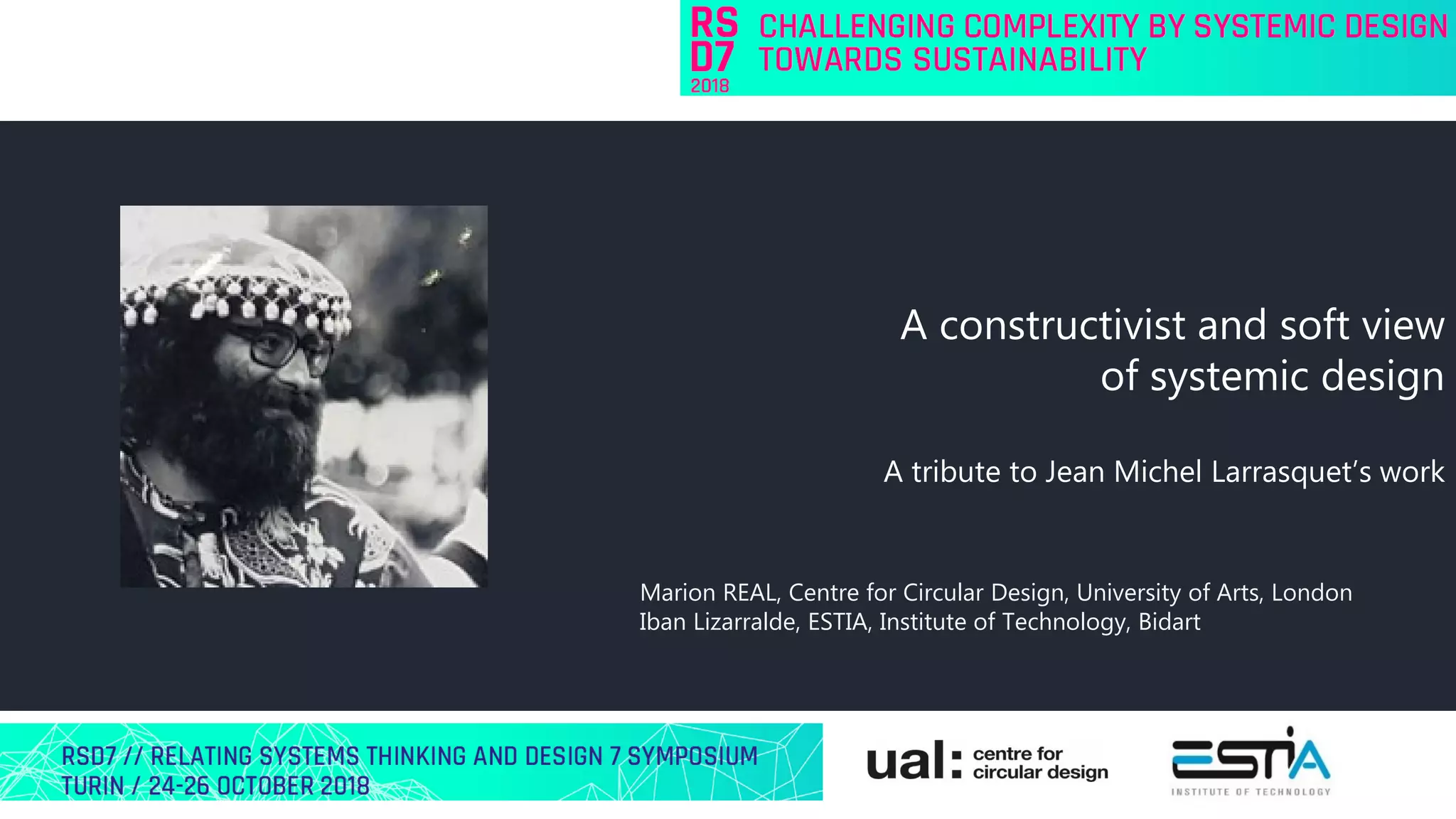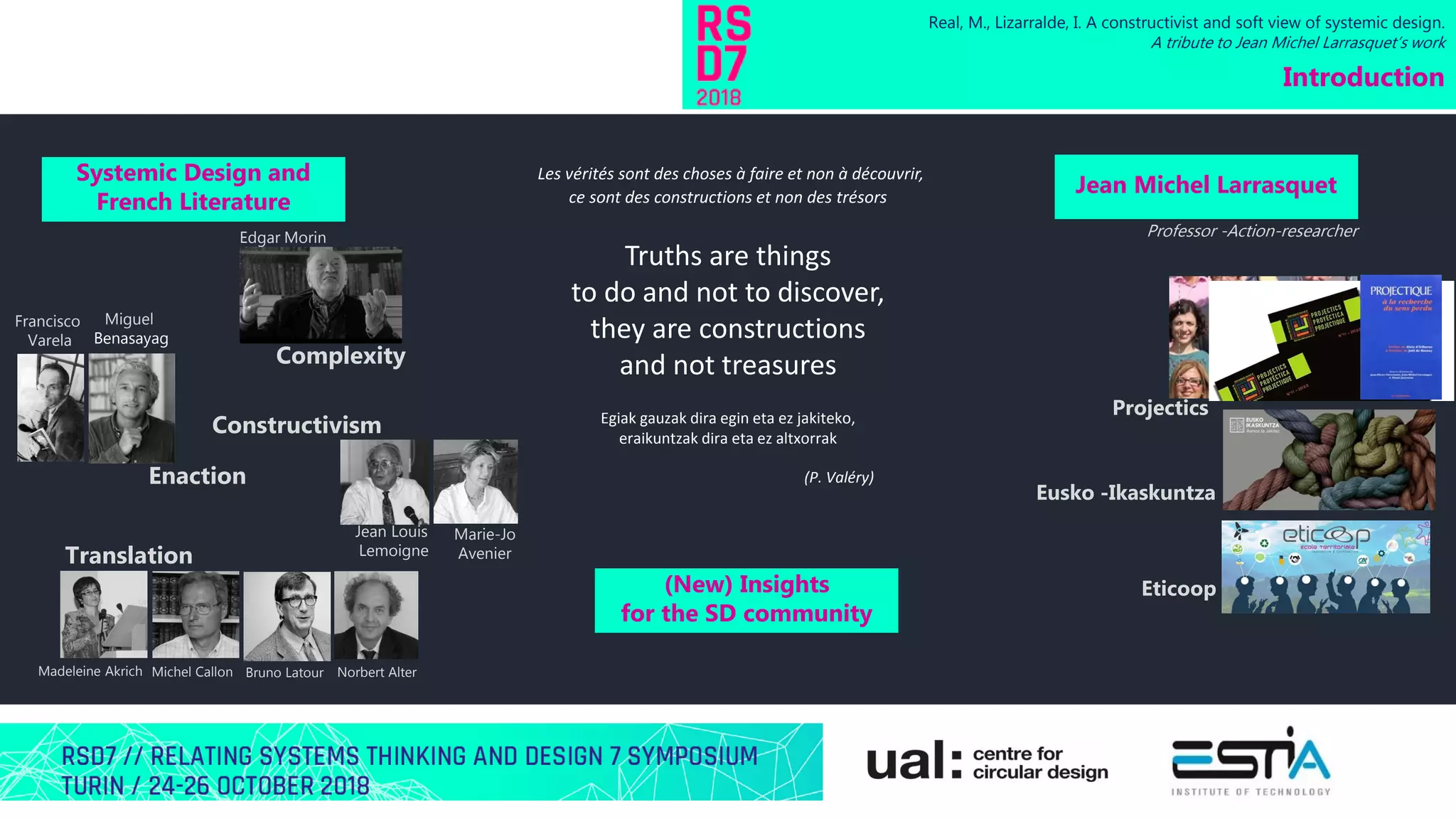 This document summarizes the work of Jean Michel Larrasquet and discusses how his work brings a constructivist and soft view of systemic design. Larrasquet studied complexity, enaction, constructivism, and translation in organizational contexts. He founded Projectics, a conference and journal on human action complexity in organizations. He also founded ETICOOP to support entrepreneurship through collaborative projects with stakeholders using design practices. Additionally, he advanced prospective work through Eusko Ikaskuntza to imagine diverse territorial futures involving citizens. His work provides insights for systemic designers, including taking action-research and meta-cognitive approaches to support transitions toward eco-sufficiency.