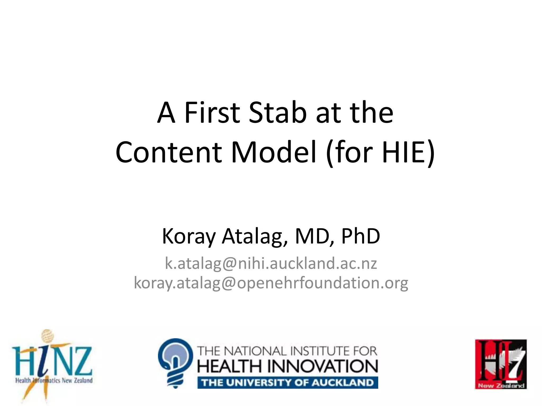 This document provides a first draft of a content model for health information exchange (HIE). It describes reusable clinical information bits called archetypes organized following the CCR standard. International and local archetypes as well as extensions can be included. When creating HIE payloads, only relevant archetypes would be included. The document discusses developing content through grassroots and governance processes and demonstrates example HIE models and capabilities.