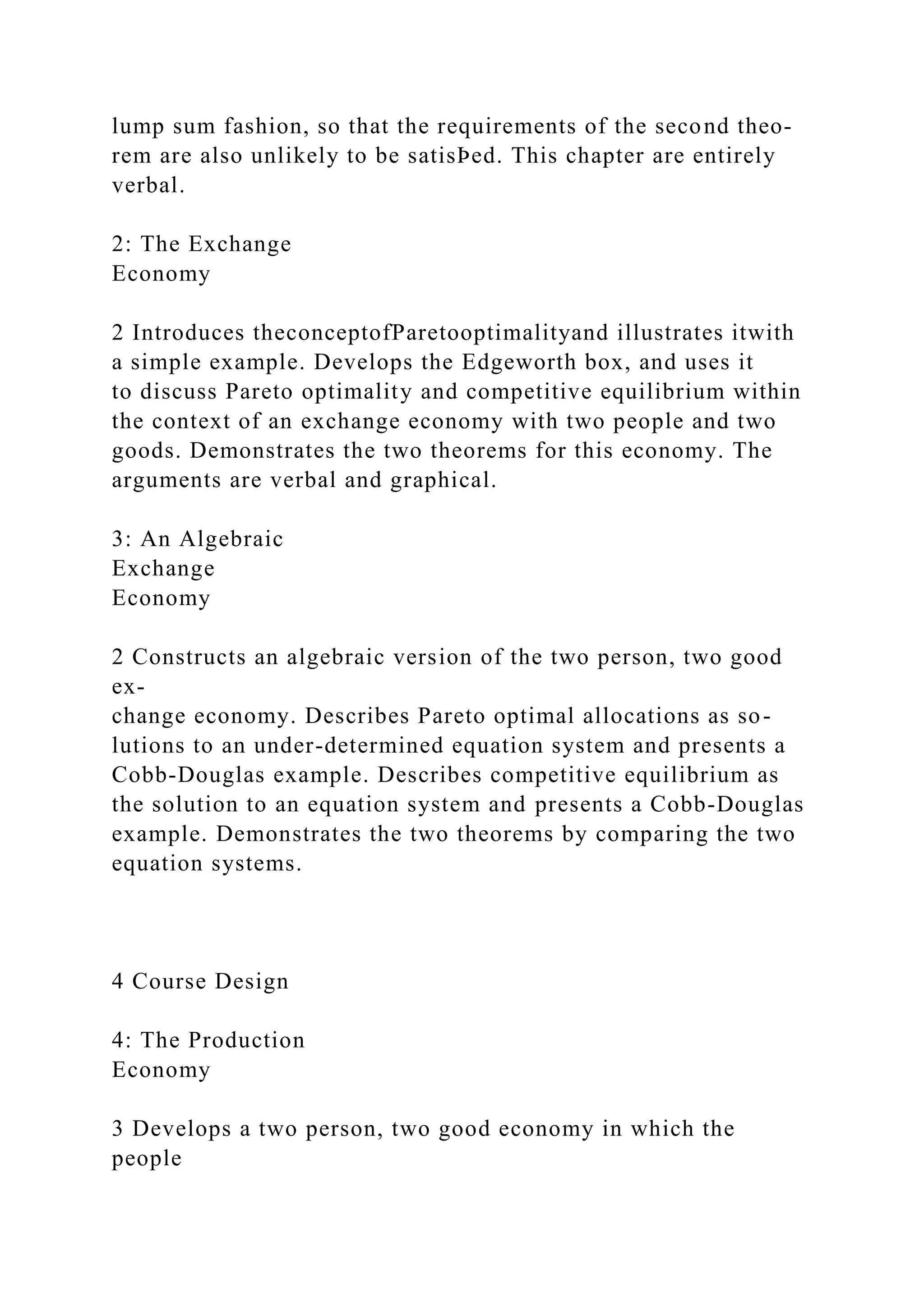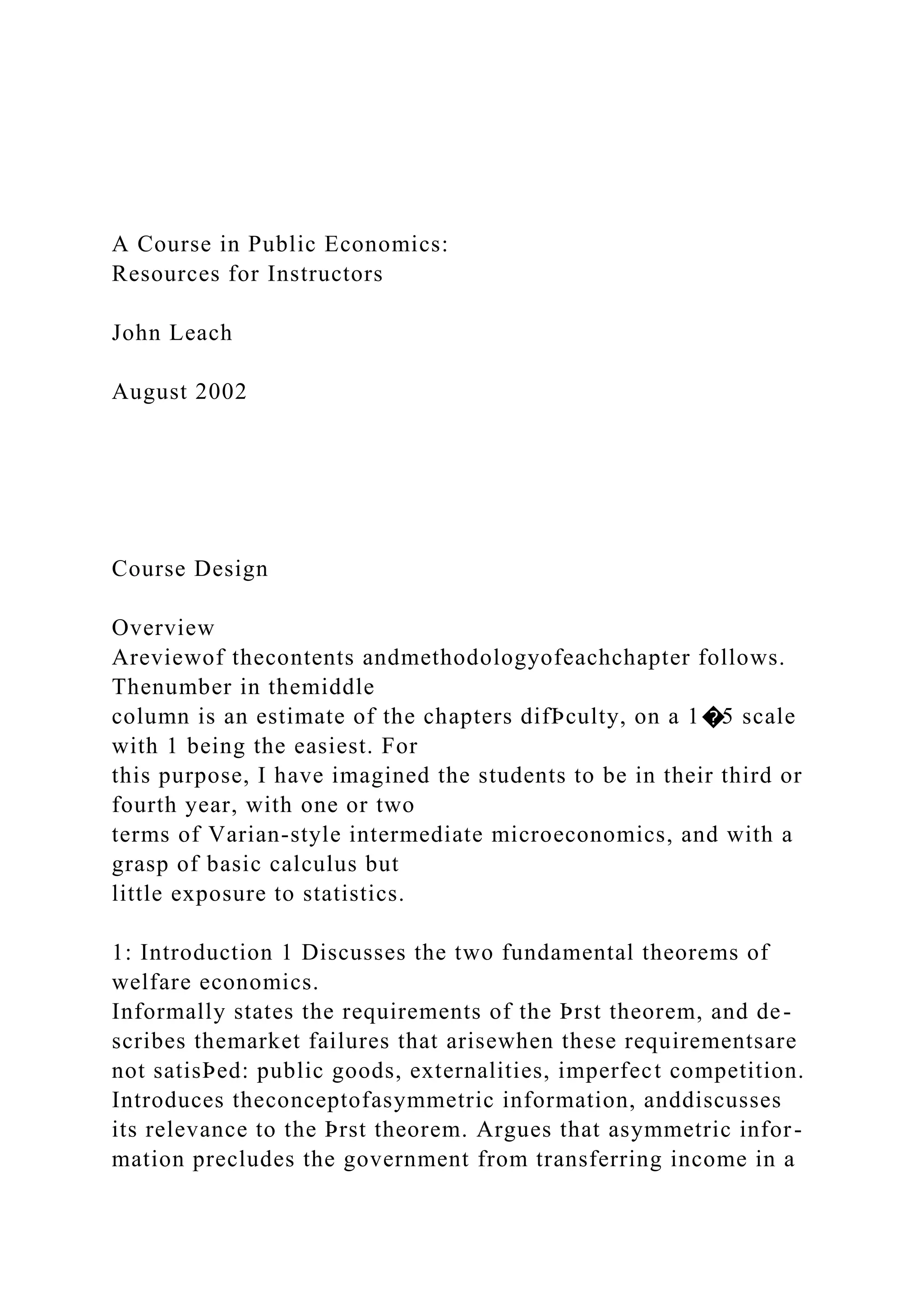 This document provides an overview of a course in public economics designed for students with a background in intermediate microeconomics and basic calculus. It details the structure and content of the course, including chapters on welfare economics, market failures, taxation, and public goods, along with suggested methodologies for instruction. The course aims to cover both theoretical foundations and practical applications, accommodating varying levels of student preparedness.