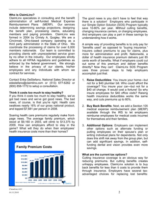 ClaimLinx specializes in consulting and benefit administration for self-funded medical plans. Their Simple Option Solution program allows employers to raise deductibles on their health plans and implement a Section 105 medical reimbursement plan to "buy back" benefits for less. This can save employers 10-80% on health costs. The implementation process involves presenting employers with customized savings projections and transitioning their plan administration to ClaimLinx as the third-party administrator. ClaimLinx handles ongoing services like claims processing and reporting to help employers lower costs while maintaining coverage for employees.