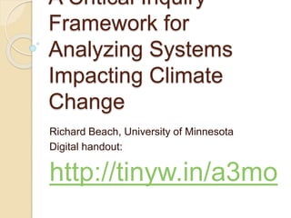 This document outlines a critical inquiry framework for analyzing systems that impact climate change. It discusses teaching students to critically examine key systems like energy, transportation, agriculture, economics and politics. Examples of classroom activities are provided to inspire change, such as redesigning a school/community, examining food consumption, keeping a consumption diary, and participating in a mock court case on climate change. The goal is to teach students how language, rhetoric and narratives shape these systems and drive either action or inaction on climate change.