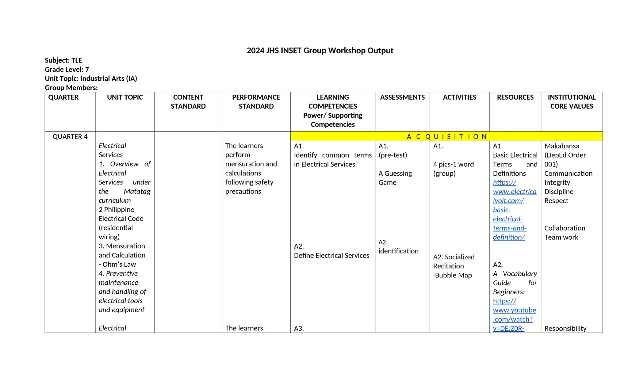 The document outlines the curriculum and learning objectives for a Grade 7 TLE (Technology and Livelihood Education) unit focusing on electrical services. It includes content standards, performance standards, learning competencies, assessments, and activities related to essential topics such as electrical code, mensuration calculations, and preventive maintenance of tools. The overarching goal is to ensure students grasp key concepts and perform practical calculations while adhering to safety measures.