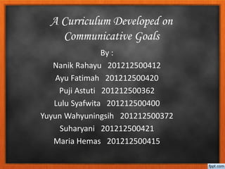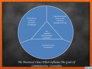 The document presents a curriculum focused on communicative goals, emphasizing the connection between language, culture, and learning methods. It outlines various theoretical views influencing communicative curricula, including sociocultural and cognitive perspectives, and highlights the importance of context in language acquisition. Additionally, it discusses the evolution of language learning theories and the role of humanistic approaches, prioritizing meaningful communication and the learner's experience.
