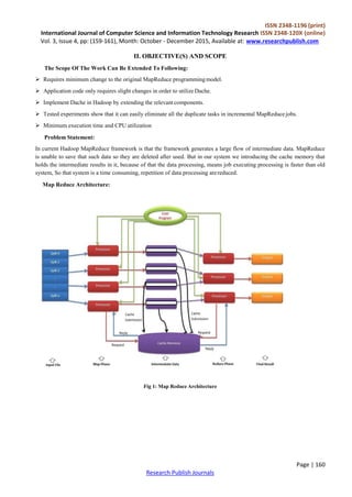 This document discusses a proposed data-aware caching framework called Dache that could be used with big data applications built on MapReduce. Dache aims to cache intermediate data generated during MapReduce jobs to avoid duplicate computations. When tasks run, they would first check the cache for existing results before running the actual computations. The goal is to improve efficiency by reducing redundant work. The document outlines the objectives and scope of extending MapReduce with Dache, provides background on MapReduce and Hadoop, and concludes that initial experiments show Dache can eliminate duplicate tasks in incremental jobs.